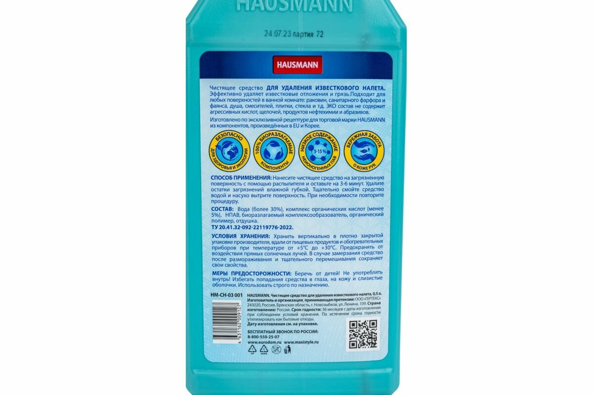 | Чистящее средство для удаления известкового налета. Эффективно удаляет известковые отложения и грязь. Подходит для любых поверхностей в ванной комнате | раковин, санитарного фарфора и фаянса, душа, смесителей, плитки, стекла и т.д. ЭКО состав не содержит агрессивных кислот, щелочей, продуктов нефтехимии и абразивов. Изготовлено по эксклюзивной рецептуре для торговой марки HAUSMANN из компонентов, произведённых в EU и Корее. |