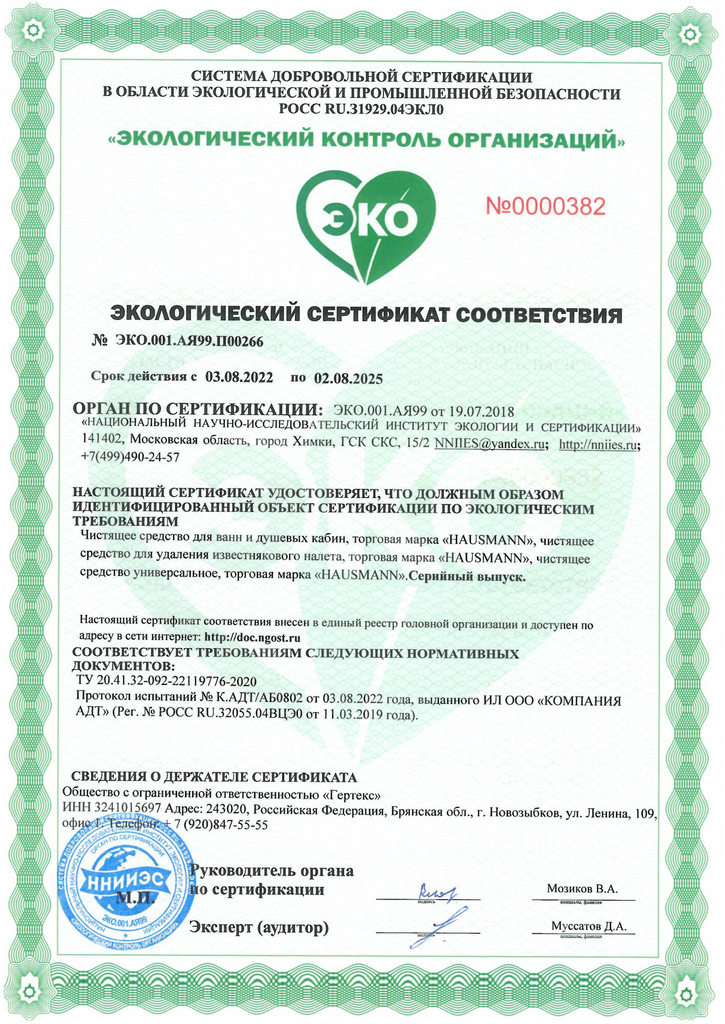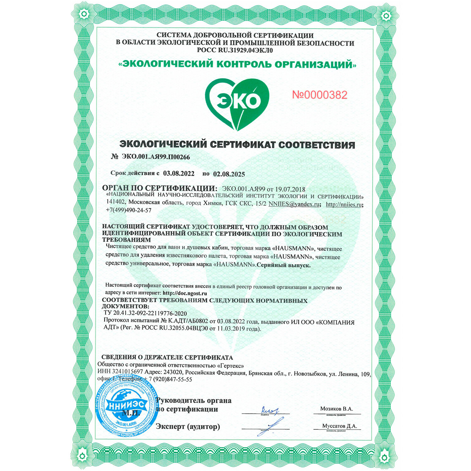 | ЭКО-сертификат | ЭКО.001.АЯ99. П00266 |