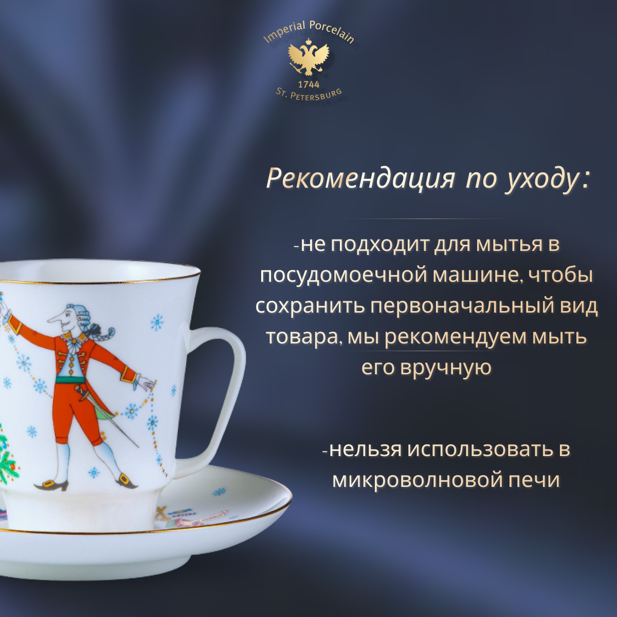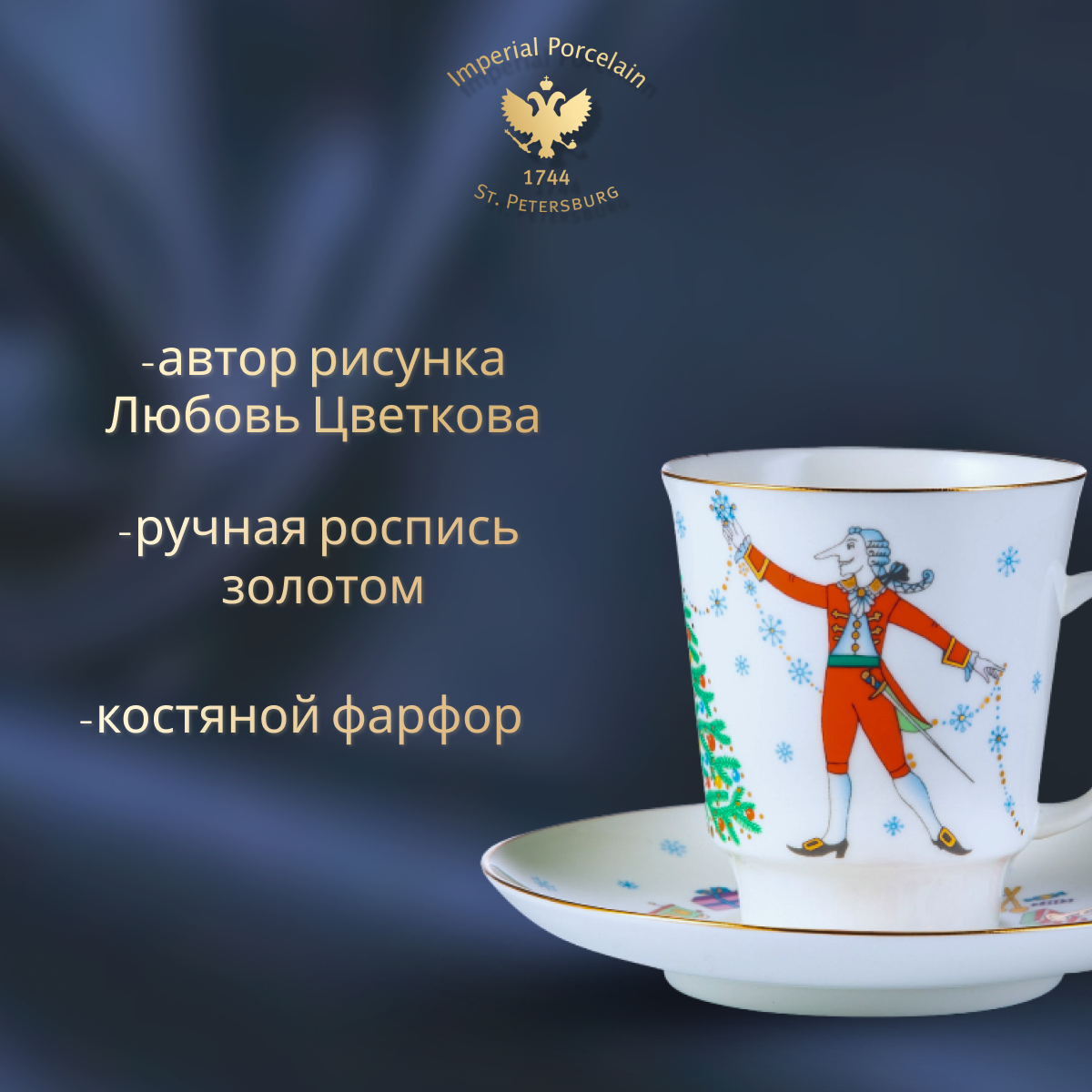 Комплект изготовлен на Императорском фарфоровом заводе из костяного фафрора. Для декорирования используется надглазурная деколь, отводка золотом. Автор рисунка - Любовь Цветкова, автор формы - Эдуард Криммер. Выпуск изделия начался в 2004 году. Комплект включает в себя 3 предмета: чашка (165 мл), блюдце, десертная тарелка. Это изделие не подходит для мытья в посудомоечной машине. Чтобы сохранить первоначальный вид товара, мы рекомендуем мыть его вручную.