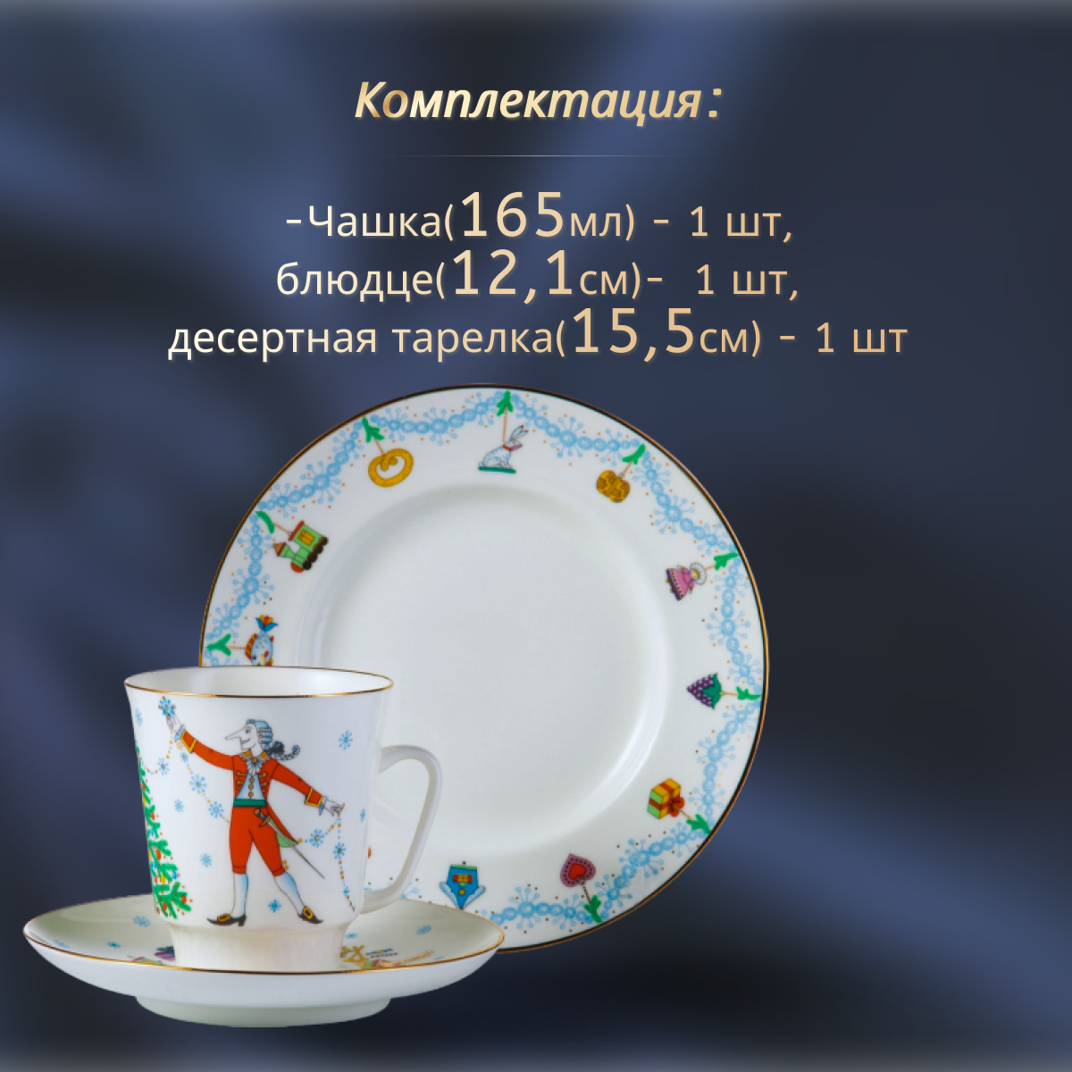 | Состав набора | блюдце - 1 шт.; десертная тарелка - 1 шт.; чашка - 1 шт. |