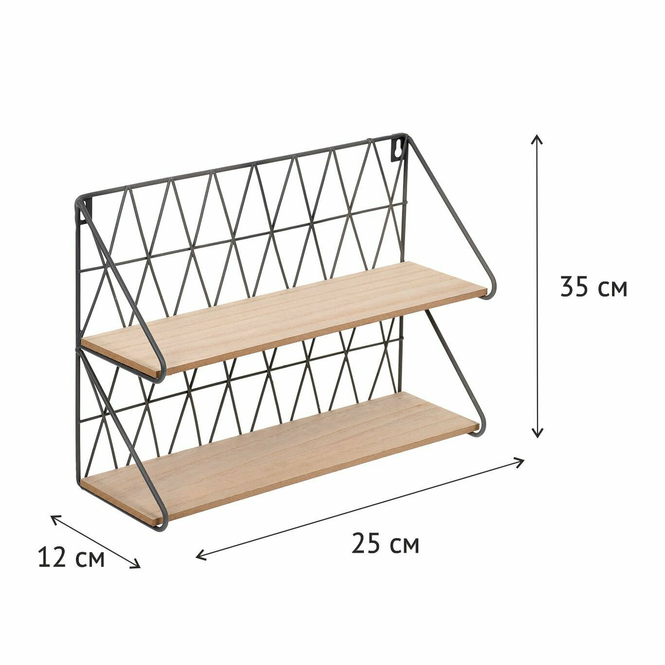 Описание: размер 35*25*12 см, максимальная нагрузка 2 кг Предназначение: Подвесные(настенные) полки – это выгодное и удачное решение для организации неиспользуемого пространства под хранение и размещение различных вещей. Эргономичные и компактные конструкции могут стать настоящей «изюминкой» интерьера. Они подходят для использования буквально в любой комнате дома. Более того, такие конструкции позволяют ещё и выгодно сэкономить на покупке шкафа, стеллажа, поскольку могут их заменить. Материал: сталь,МДФ Состав: сталь,МДФ
