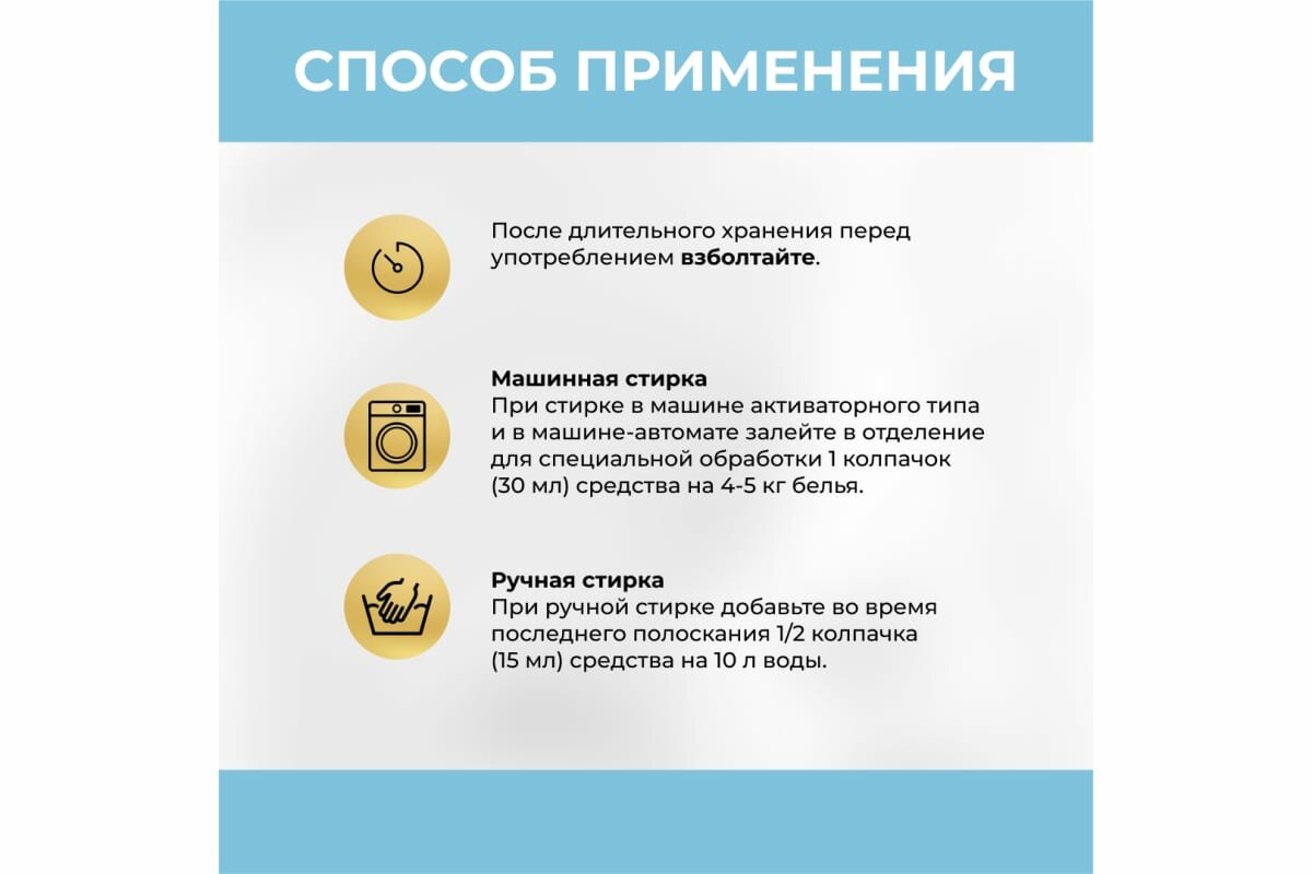 | Способ применения | После длительного хранения перед употреблением взболтайте. Машинная стирка: при средней загрузке стиральной машины: 15 мл средства на 2-3 кг одежды. При полной загрузке стиральной машины и стирке в жесткой воде |