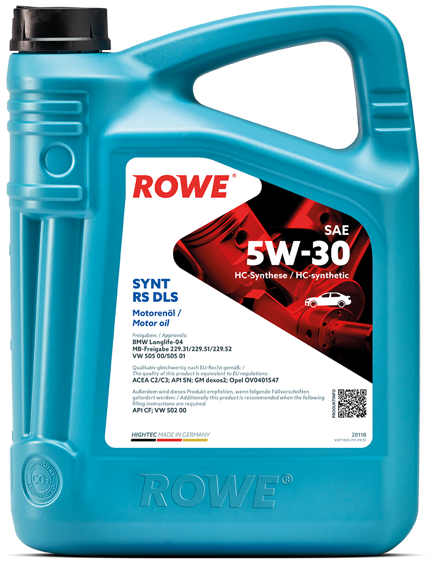 HIGHTEC SYNT RS DLS SAE 5W-30 - Всесезонное моторное масло с хорошими антифрикционными свойствами премиум-класса на основе технологии HC-Synthese для бензиновых и дизельных двигателей легковых автомобилей с турбонаддувом и без турбонаддува, включая сажевые фильтры. Этот лидирующий продукт особенно хорошо подходит как рационализированное масло согласно данным спецификациям. ПрименениеHIGHTEC SYNT RS DLS SAE 5W-30 было специально разработано в соответствии с требованиями современных бензиновых и дизельных автомобилей. Оно отвечает требованиям многочисленных производителей транспортных средств и спецификации ACEA C3, предъявляемых к малозольным продуктам. Масло используется согласно предписаниям производителя в транспортных средствах с бензиновыми и дизельными двигателями с системами нейтрализации отработавших газов (DPF = сажевый фильтр) или без них. При этом оно также хорошо подходит для транспортных средств, оснащенных двигателями с турбонаддувом или без. В транспортных средствах BMW оно обратно совместимо с более ранними спецификациями BMW Longlife-01/98. Для транспортных средств Opel/GM оно заменяет более ранние спецификации GM-LL-A-025 или GM-LL-B-025. Допуск: BMW Longlife-04 GM dexos2 (Primary License No.: RB2D0113096) MB-Freigabe 229.31/229.51/229.52 VW 505 00/505 01 Равноценно по качеству в соответствии с законодательством ЕС: ACEA C2/C3 API SN Opel OV0401547 Кроме того рекомендуется к применению, когда соответствует: API CF VW 502 00