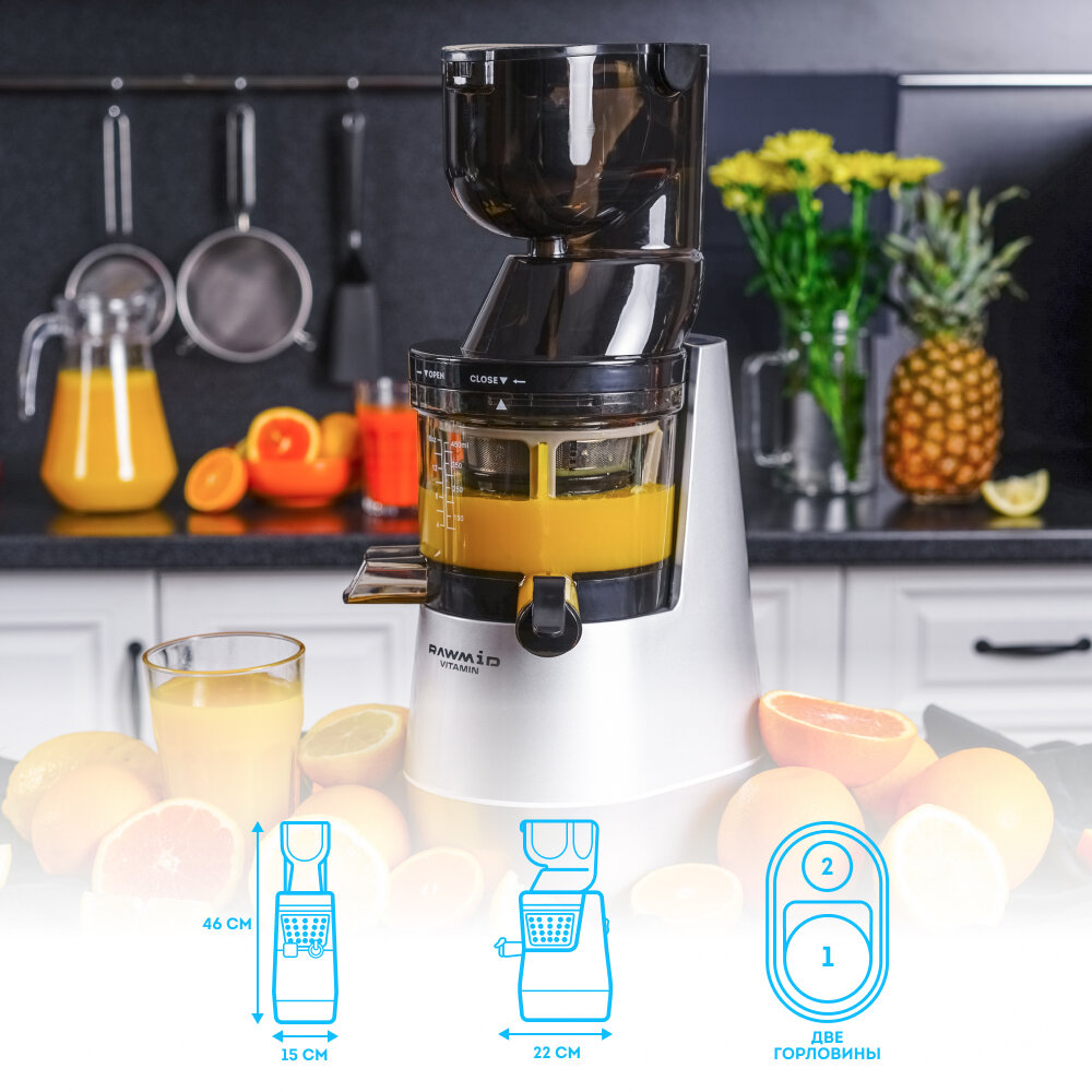 Шнековая соковыжималка RVJ-02 от RAWMID производит соки с помощью технологии холодного отжима. В готовом напитке сохраняются все витамины и полезные вещества. Особенности RVJ-021. Бережный отжим. Соковыжималка готовит сок на низких оборотах (38 об/мин), поэтому продукты не перегреваются и не окисляются. На выходе получается полезный сок с большим количеством витаминов.2. Низкий уровень шума. Мотор обладает мощностью 150 Вт, но при этом работает довольно тихо. Вы можете готовить соки утром или поздним вечером, не боясь разбудить свою семью или соседей. 3. Широкое загрузочное отверстие. В горловину размером 80 мм можно проталкивать продукты целиком и не тратить время на их нарезку. 4. Дополнительная горловина. А для продолговатых ингредиентов (морковь, сельдерей) предусмотрено альтернативное загрузочное горло. 5. Безопасная загрузка продуктов. Загрузочное отверстие оснащено уникальным механизмом, который защитит ваши пальцы от шнека. 6. Запирающий клапан. Система капля-стоп, позволит вам перекрывать подачу сока и смешивать разные вкусы прямо в самой соковыжималке.7. Простое управление. Для эксплуатации соковыжималки достаточно лишь одной кнопки.8. Компактность. Прибор не отберет много места с вашей кухни (длина и ширина 15 x 22 см, высота – 46 см).9. Безопасные материалы. Все детали соковыжималки произведены из экологичных материалов, которые не навредят вашим продуктам. 10. Многофункциональность. При покупке вы получаете сетку с мелкими отверстиями, экран-измельчитель для мороженого и пресс для тофу. Хотите дополнительное сито в подарок? Оставьте фото-отзыв