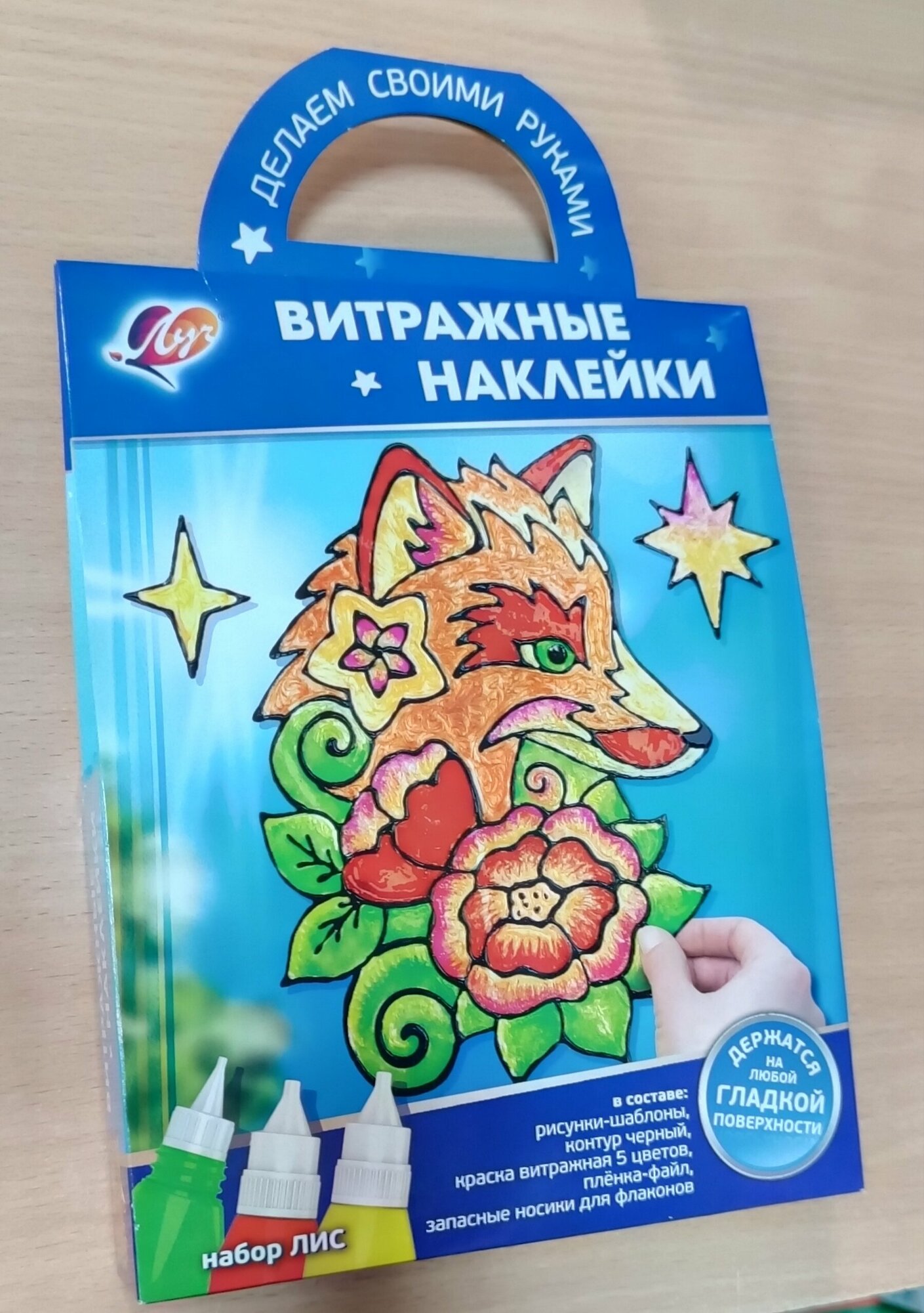 Состав набора: витражная краска в тубах по 15 мл 5 цветов, чёрный контур, рисунок - шаблон, файл А4, запасные носики для флаконов.