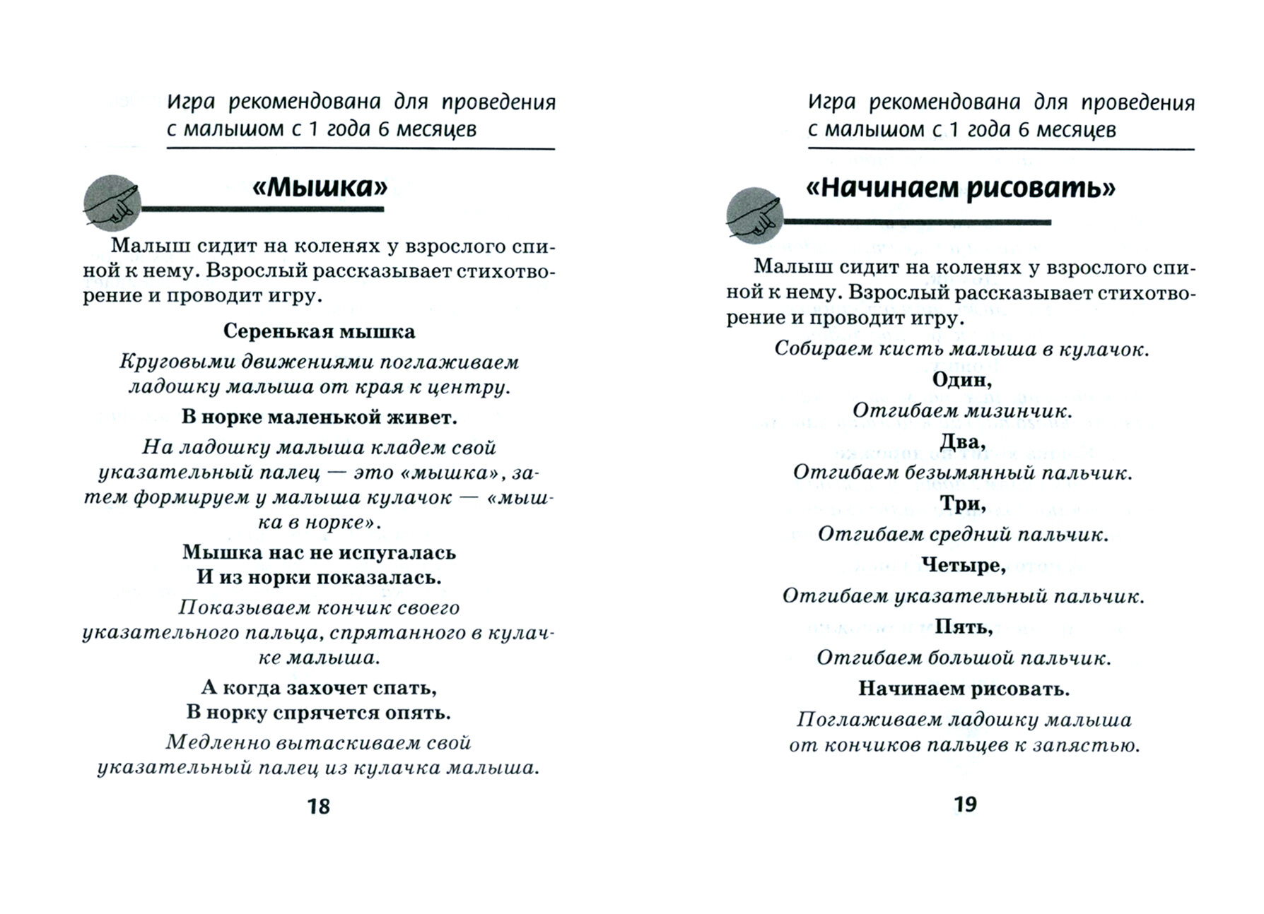 маленькая,тоненькая книжечка,удобно с собой брать,прямо-таки карманного типа,приведено много разных игр ,заниматься смело можно с 3 месяцев.Достаточно ёмкий материал,несмотря на размеры. Книжку очень рекомендую молодым мамочкам и папочкам, так как реалтно очень помогает в занятиях с ребенком,ведь приведено к стихам описание,когда и как действовать.