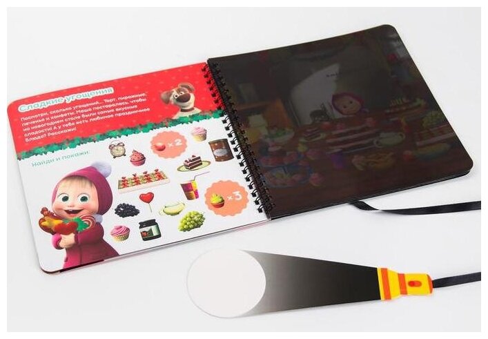 Помогите Маше и Медведю найти пропажу, посмотрите как проходит подготовка к Новому году. Для этого малышу нужно взять фонарик, найти и сосчитать разные предметы.