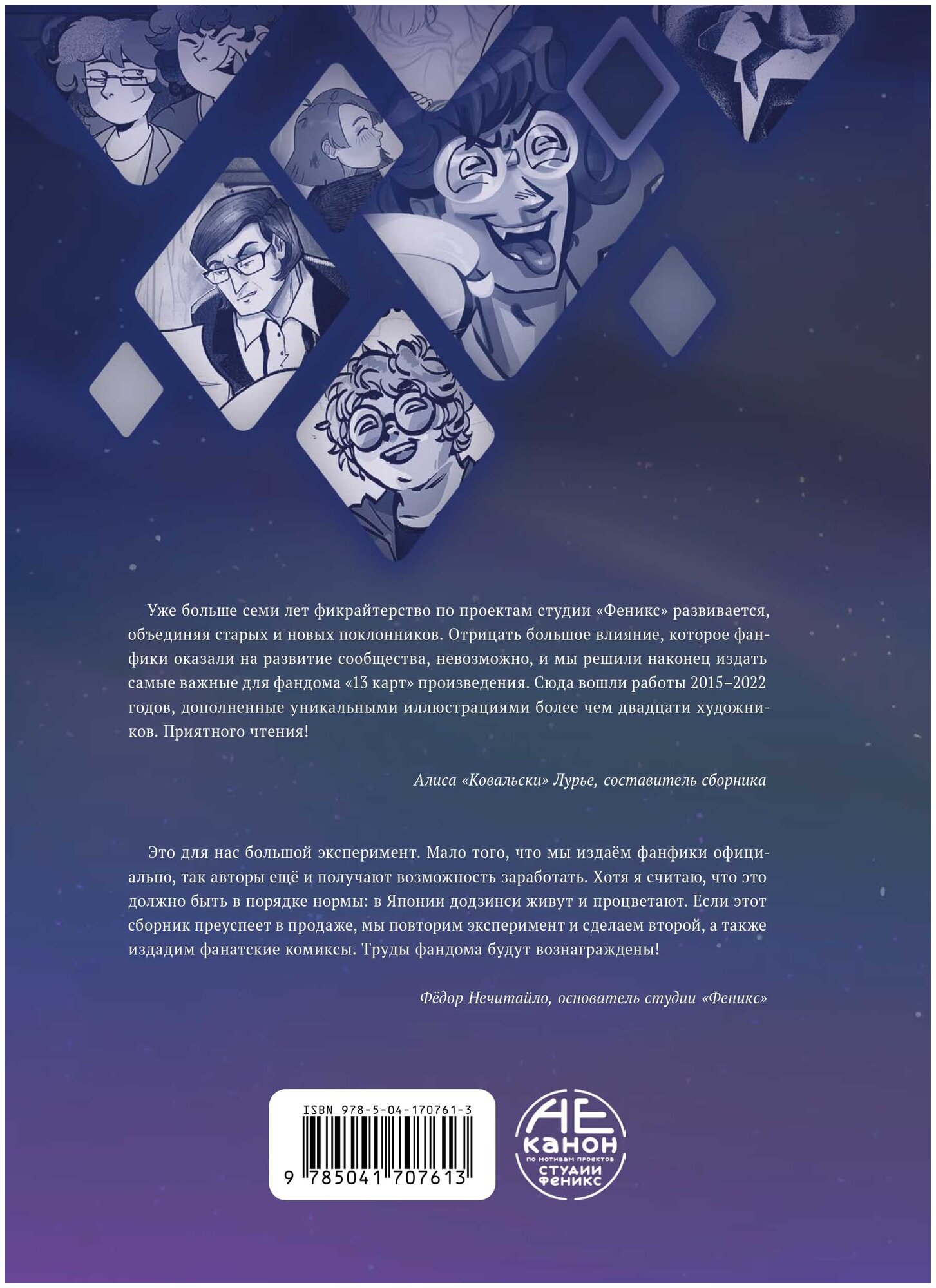 Уже больше семи лет фикрайтерство по проектам студии "Феникс" развивается, объединяя старых и новых поклонников. Отрицать большое влияние, которое фанфики оказали на развитие сообщества, невозможно, и мы решили наконец издать самые важные для фандома "13 карт" произведения. Сюда вошли работы 2015-2022 годов, дополненные уникальными иллюстрациями более чем двадцати художников. Приятного чтения!