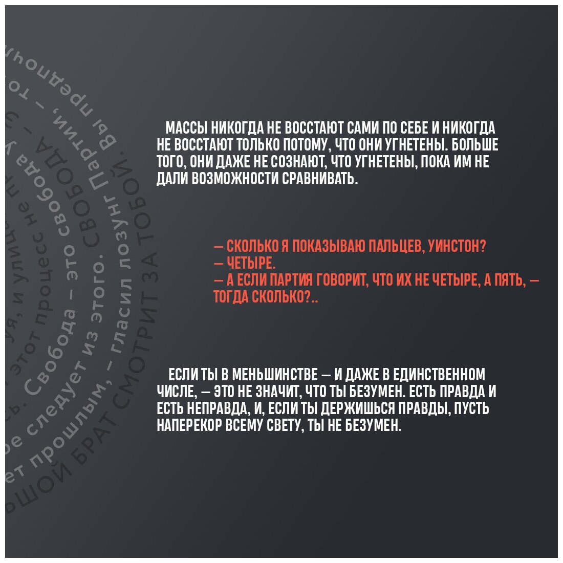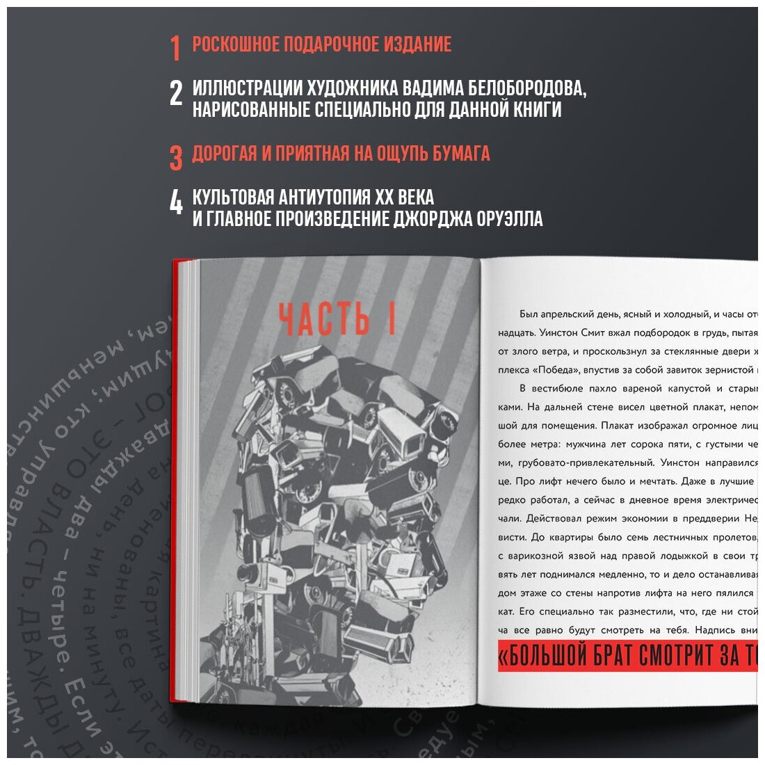 Культовая антиутопия XX века и главное произведение Джорджа Оруэлла заиграет новыми красками благодаря иллюстрациям художника Вадима Белобородова, нарисованным специально для данного издания. Макет книги органично поддерживает иллюстрации: красивый, простой, жесткий, как и сам роман.