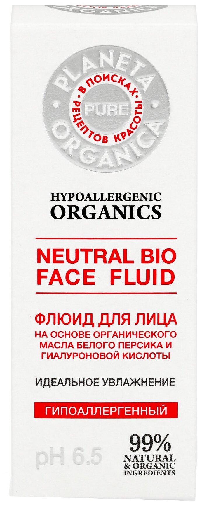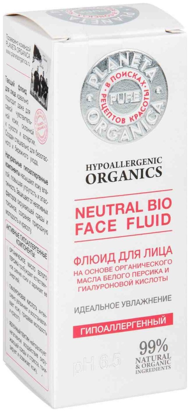 Наша кожа, подобно всему организму, нуждается в увлажнении и питании. Об этом может позаботиться крем-флюид для лица Planeta Organica Гипоаллергенный с маслом белого персика и гиалуроновой кислотой. Тающий флюид для лица на основе органического масла белого персика и гиалуроновой кислоты идеально подходит даже для самой чувствительной кожи, склонной к сухости и раздражению. Крем для лица увлажняющий создан специально для безопасного и бережного ухода. Натуральные гипоаллергенные компоненты насыщают кожу влагой, повышая упругость и эластичность. Компоненты крема для лица защищают от негативных факторов окружающей среды и токсинов, сохраняя природную молодость и красоту. Солнцезащитный крем для лица / крем для лица антивозрастной / уход за кожей / крем для ухода за кожей Состав: Aqua with infusions of Organic Prunus Persica Kernel Oil (органическое масло белого персика), Sodium Hyaluronate (гиалуроновая кислота), Zink PCA (цинк), Faex (пивные дрожжи), Triticum Vulgare Starch (пшеничный крахмал); Glycerin (растительный глицерин), Pectin (пектин из яблочной кожуры), Panthenol (провитамин В5), Sweet Almond Oil Polyglyceryl-6 Esters (натуральный кондиционирующий компонент и ПАВ на основе миндаля), Xanthan Gum (натуральный полисахарид), Sodium Benzoate (пищевой консервант из ягод брусники), Potassium Sorbate (пищевой консервант из ягод рябины).