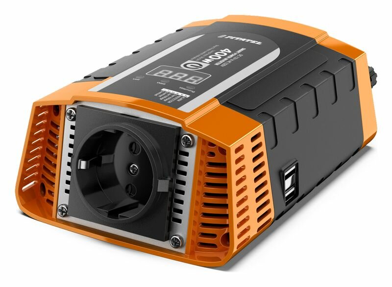 Автомобильный преобразователь напряжения Pitatel , предназначенный для питания от бортовой сети автомобиля 12 В электронных устройств, работающих от сети переменного тока 220 вольт, или от USB.