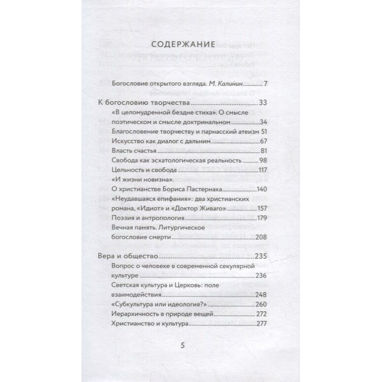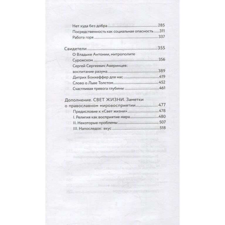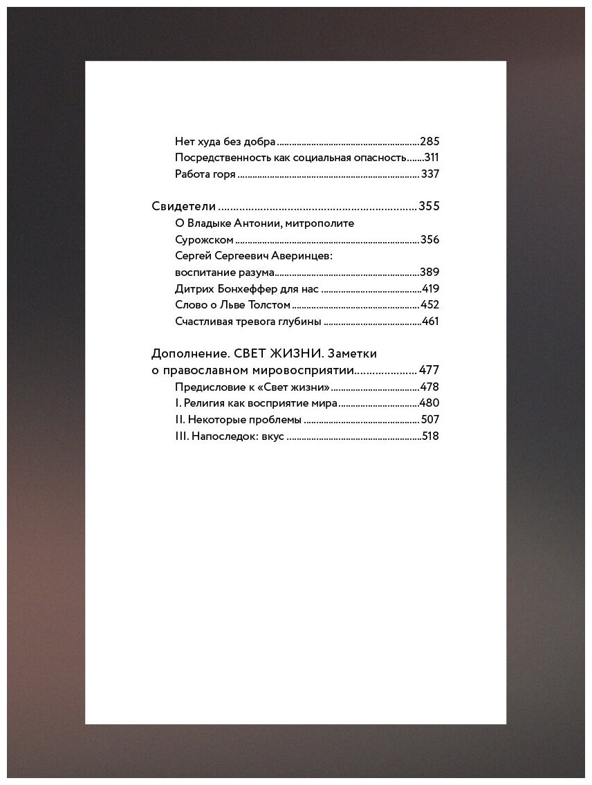 В книгу вошли эссе о богословии творчества, непростых отношениях Церкви и современного постсоветского секулярного общества, а также о великих христианских свидетелях ХХ века. Завершает книгу эссе «Свет жизни. Заметки о православном мировосприятии». В качестве предисловия — очерк Максима Калинина об удивительной встрече богословия творчества Ольги Седаковой и «естественного созерцания» в восточносирийской христианской мистической традиции.
