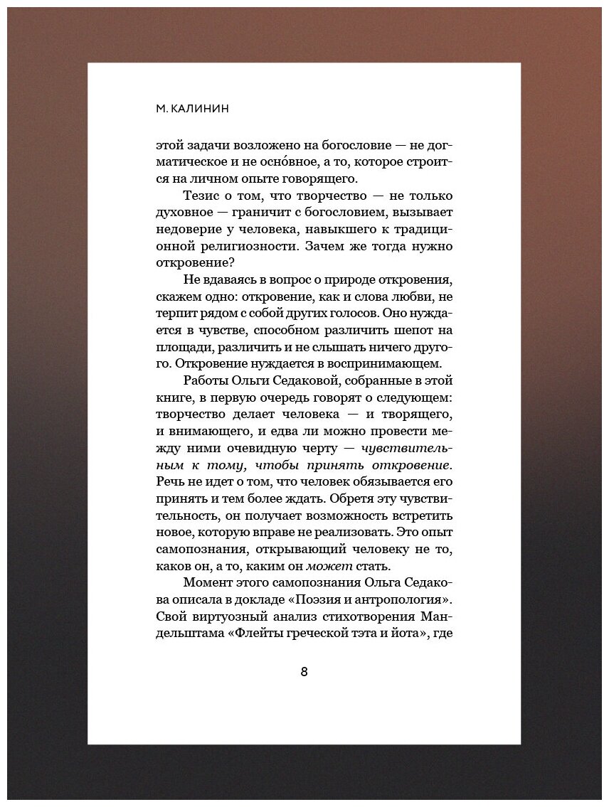 На страницах книги мы встречаемся с вдохновляющим взглядом поэта на христианство — и с любящим взглядом христианина на свободное человеческое творчество. Вслушиваясь в голоса как церковной, так и светской культуры — от Пастернака до митрополита Антония Сурожского, от Бонхеффера до Аверинцева, — Ольге Александровне неизменно удаётся расслышать и донести весть о высоком достоинстве человека и о единственной власти, к которой он всегда по-настоящему стремится, — власти счастья.