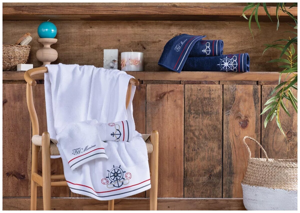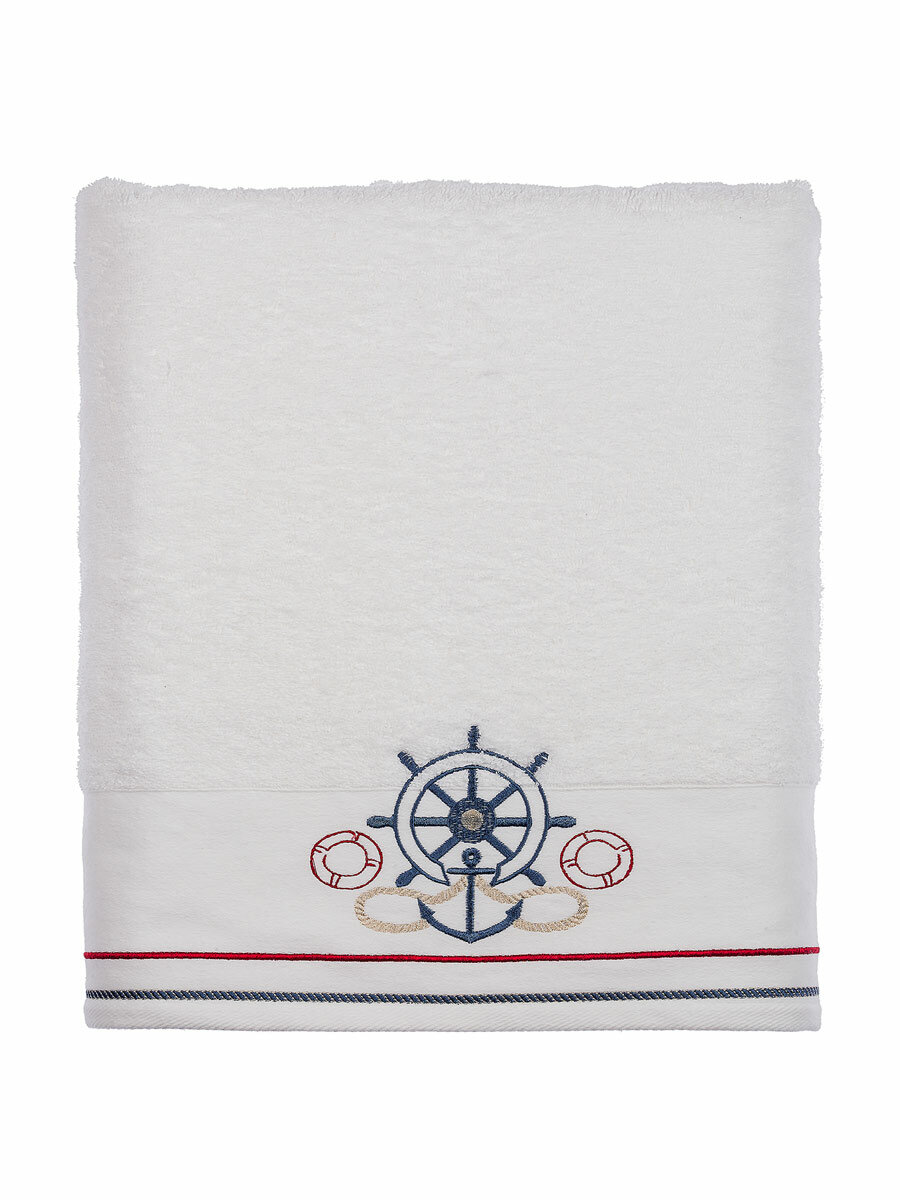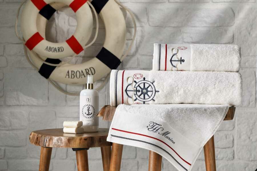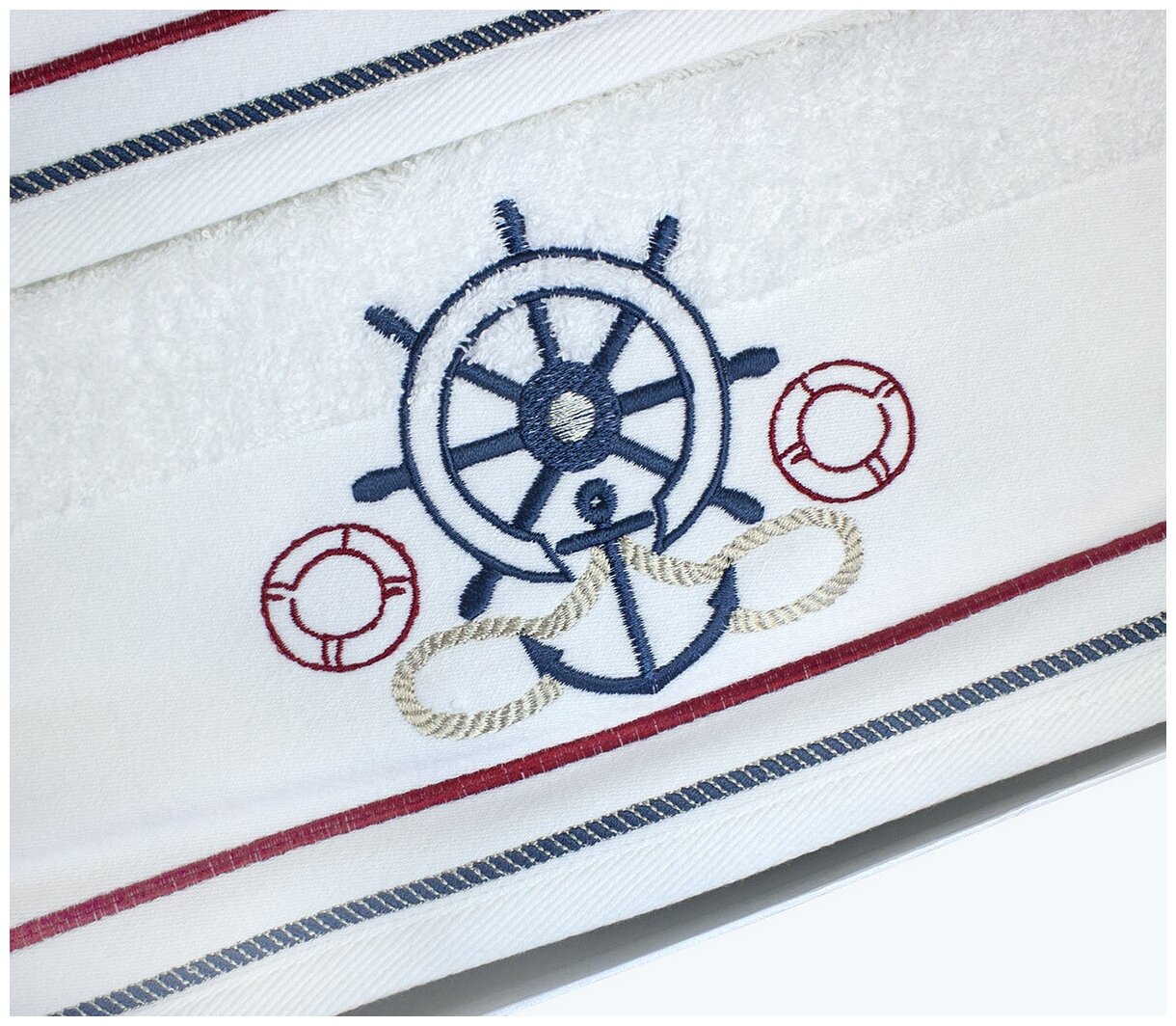 Махровое полотенце в морском дизайне от Tivolyo. На мягкой хлопковой махре расположилась контрастная вышивка и полоски. Материал нежный и очень приятный на ощупь, такое полотенце гипоаллергенно и идеально подойдет как взрослым, так и детям.