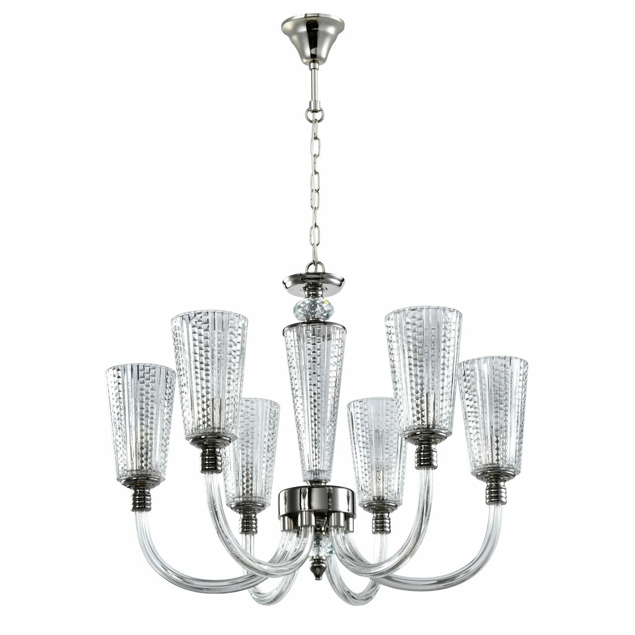 Металлическое основание гальванизировано в цвет хрома. Рожки выдуваются вручную из гутного стекла. Светильник декорирован плафонами из фактурного прозрачного стекла. Центральная ось декорирована массивами хрусталя.