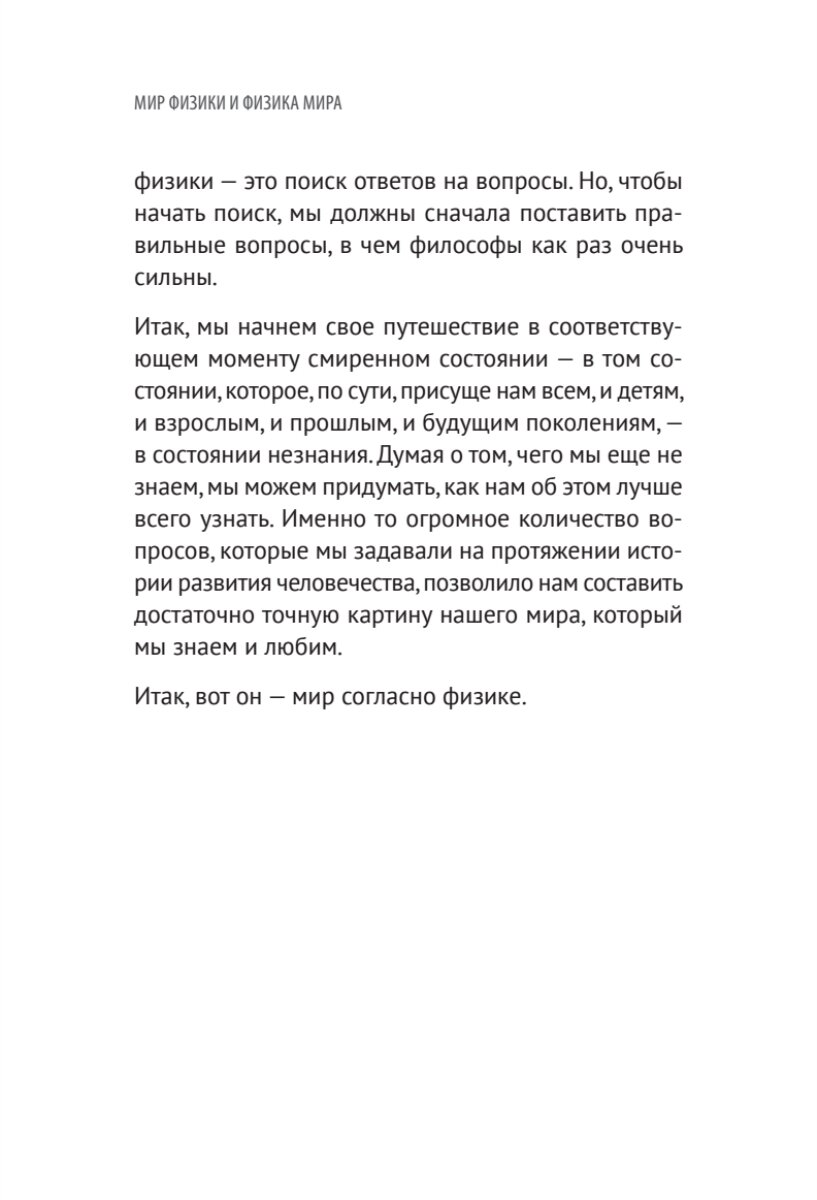 Физика в школе давалась трудно, хотя я уже тогда понимала, что это потрясающая наука, которая окружает нас и существует в каждом проявлении этого мира. Однако, с трудом отсидев последний урок физики, ощущая на себе неприятный взгляд физички, наши отношения с этой наукой закончились. И как же грустно, что физика не может преподаваться в школе так, как преподносит ее автор в своей книге "Мир физики и физика мира", которая попалась мне на полке магазина. Может на восприятие материала повлияло искреннее признание автора в любви к этой науке и потому его рассказ о ней просто захватывает. Автор раскрывает эту науку глубоко, но просто и точно, позволяя законам мироздания стать доступными для большой аудитории, многие из которых скорее всего все еще помнят тяжелый взгляд школьной физички. А ведь возможности физики практически безграничны, она простирается от прошлого к будущему, захватывая абсолютно все, что нас окружает, и даже то, что неподвластно нашему глазу. И если вас все еще пугают заголовки, относя вас за школьную парту, то просто скорее приступайте читать. Нет ничего приятней, чем слушать человека, который действительно и полностью увлечен своим делом.