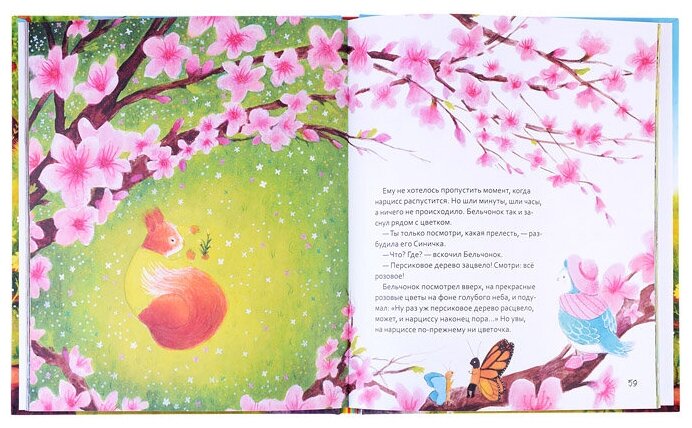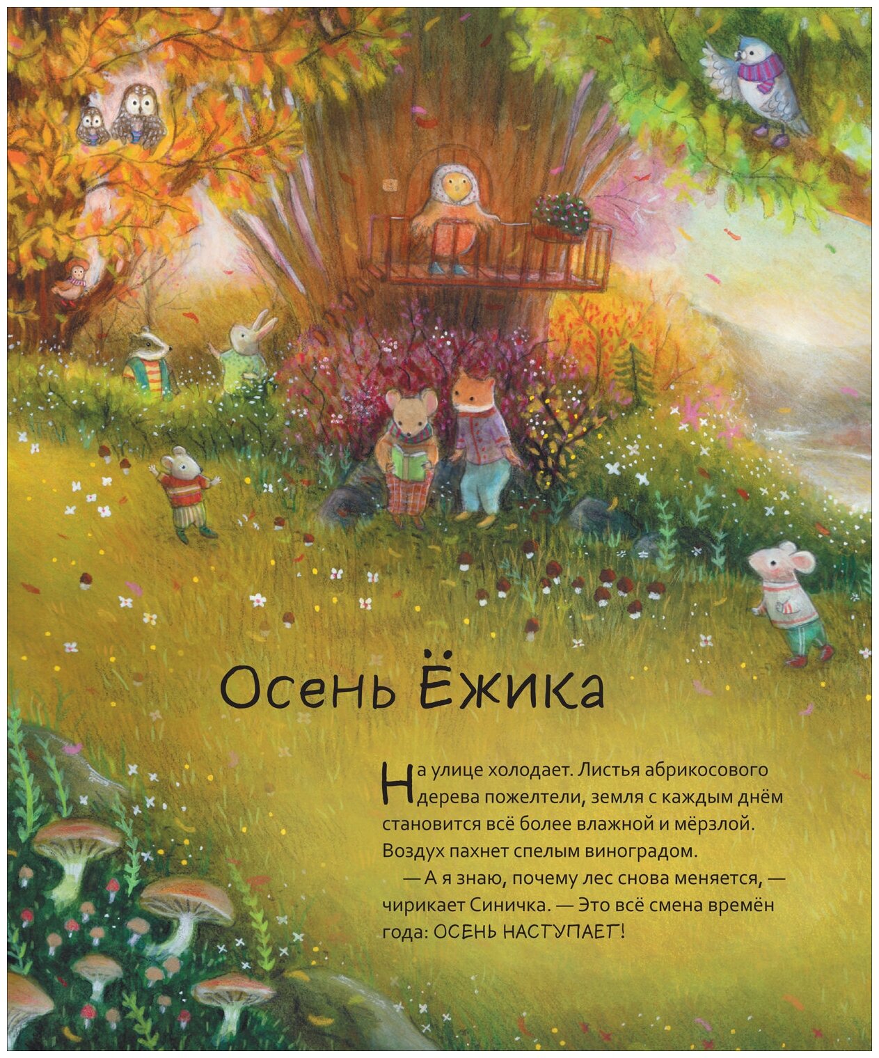 Добрая книжка про друзей. В ней больше картинок, чем текста. Шрифт мелкий, так что читать ребенку будет взрослый. Четверо друзей - Ежик, Зайка, Синичка и Бельчонок - вместе играют, устраивают праздники и пикники, поддерживают и утешают друг друга. В книге, соответственно, 4 истории: "Осень Ежика", "Зайкина зима", "Весна Бельчонка" и "Синичкино лето". Можно познакомить ребенка с временами года, правда, в России все-таки другой климат, так что лес в этой книжке кажется немного... нереальным. Но это ни в коем случае не минус. Иллюстрации очень красивые! И детализированные, что тоже важно. Можно подолгу рассматривать их с ребенком. Я сама на них всякий раз засматриваюсь, когда сын просит почитать эти сказки.