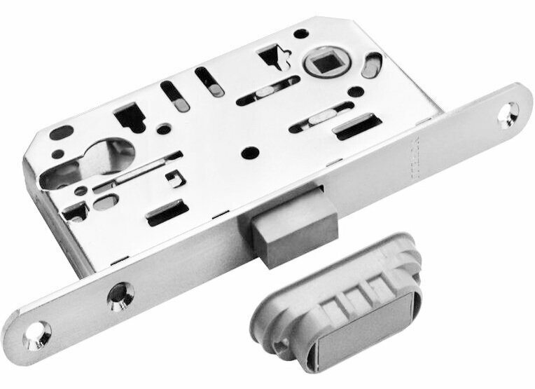 Защелка межкомнатная магнитная под цилиндр MORELLI M1885 SC, цвет матовый хром предназначена для межкомнатных дверей с последующей установкой дверной ручки в верхнее отверстие защелки и ключевого цилиндра с накладкой на ключевой цилиндр - в нижнее. Межосевое расстояние 96 мм. Защелка имеет универсальную направленность - может быть установлена на полона как правого, так и левого отпирания. Язычок защелки магнитный и выполнен из пластикого композита, что обеспечивает почти бесшумную работу. Торцевая планка защелки имеет скругленные углы, что удобно при подготовке посадочного места при врезке фрезой и задает аккуратный внешний вид врезке. Саморезы и ответная планка в цвет изделия в комплекте. Упаковка картонная с держателем для навески.