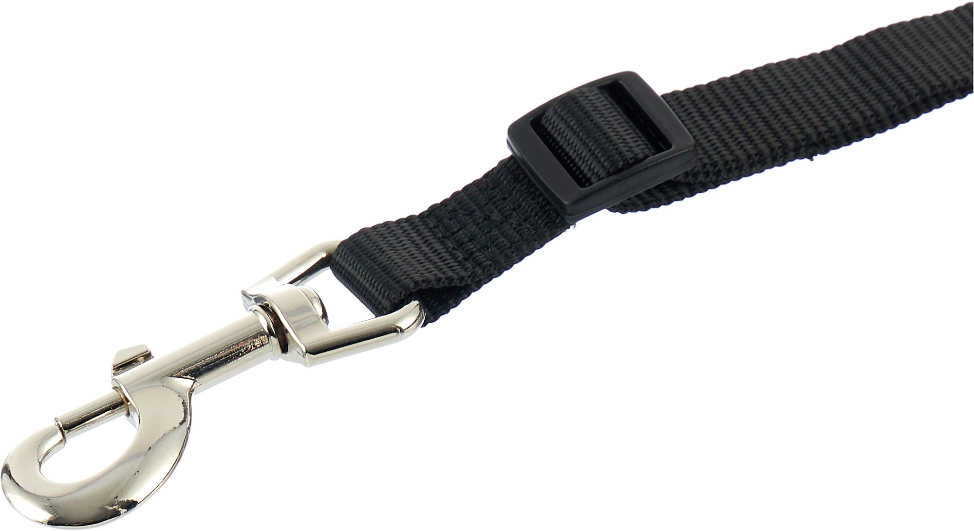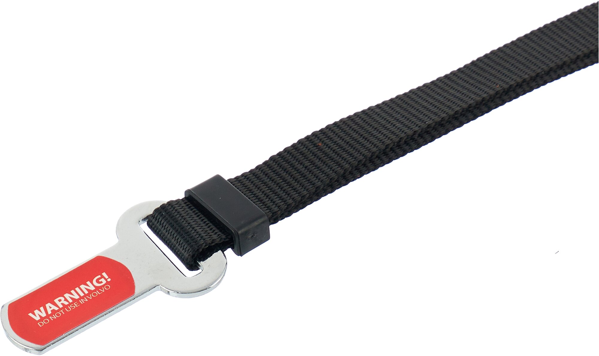 Крепление поводка с одной стороны снабжено карабином, который рекомендуется прикреплять к шлейке, в крайнем случае к ошейнику, а с другой стороны, металлическая скоба, которая подходит для стандартных замков ремней безопасности в автомобилях (кроме VOLVO).