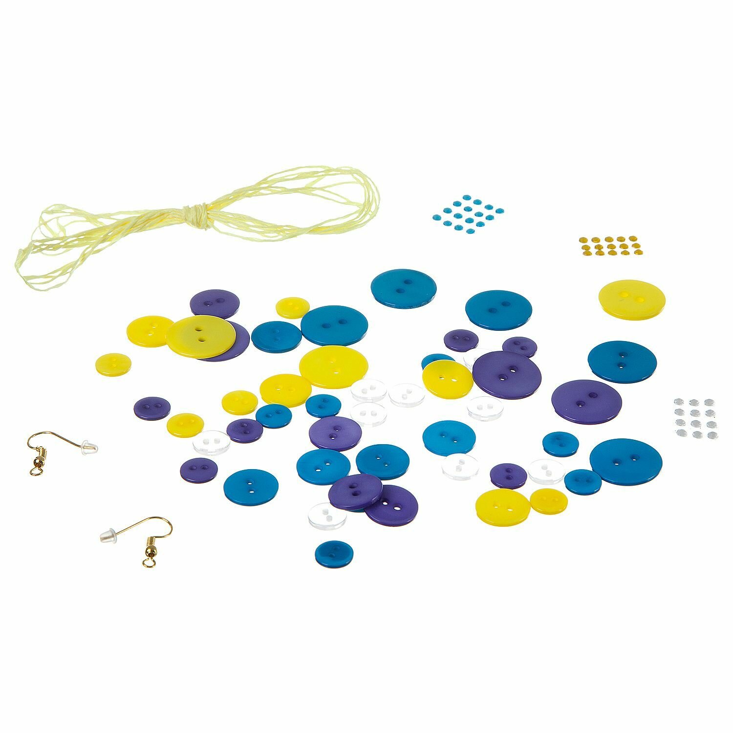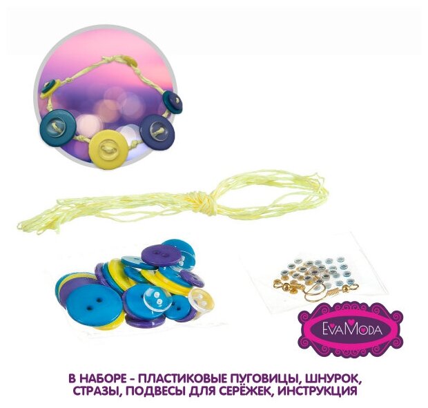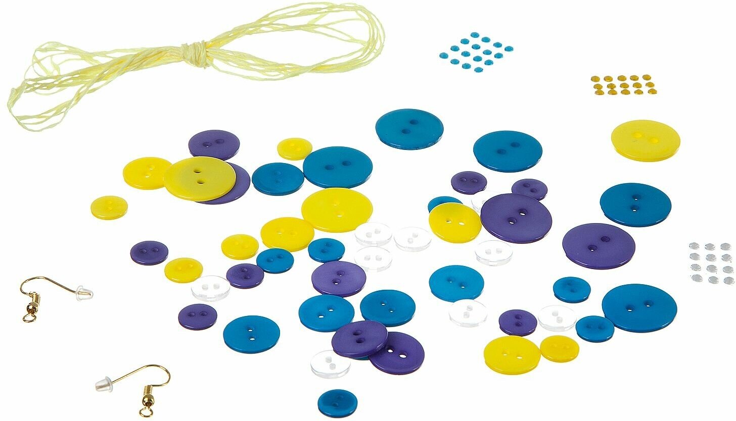 В наборе разноцветные пуговицы, самоклеящиеся стразы, основа для подвески и крючки-сережки.