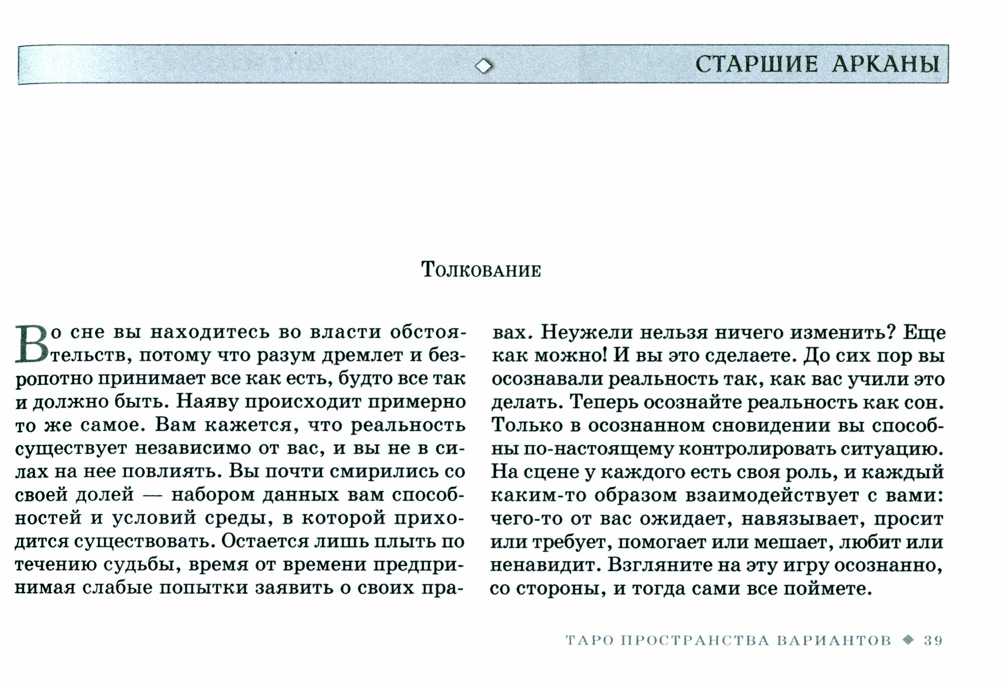 Это только руководство к колоде. Карты покупала отдельно. Печать хорошая, есть черно-белые иллюстрации каждой карты, введение и примеры раскладов. Толкование отличается от Уэйта, поэтому данное руководство необходимо. Трактовка основывается на понятиях трансерфинга.