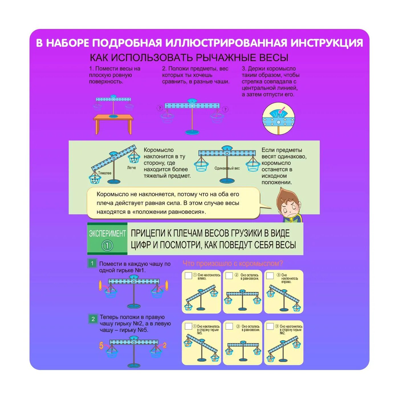 В состав набора входят подставка, указатель, чаша весов, гирьки в виде цифр, стойка, коромысло весов, подпятник (ось вращения коромысла), нить, металлический крючок, корректирующий груз, иллюстрированная инструкция.