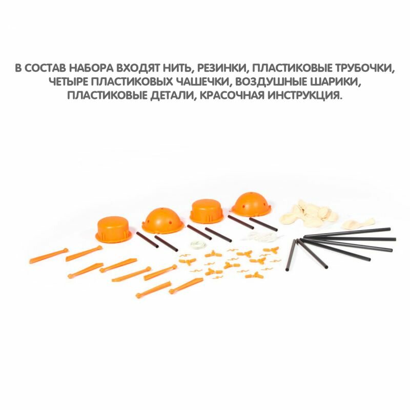 В наборе: входят нить, резинки, пластиковые трубочки, четыре пластиковых чашечки, воздушные шарики, пластиковые детали, красочная инструкция