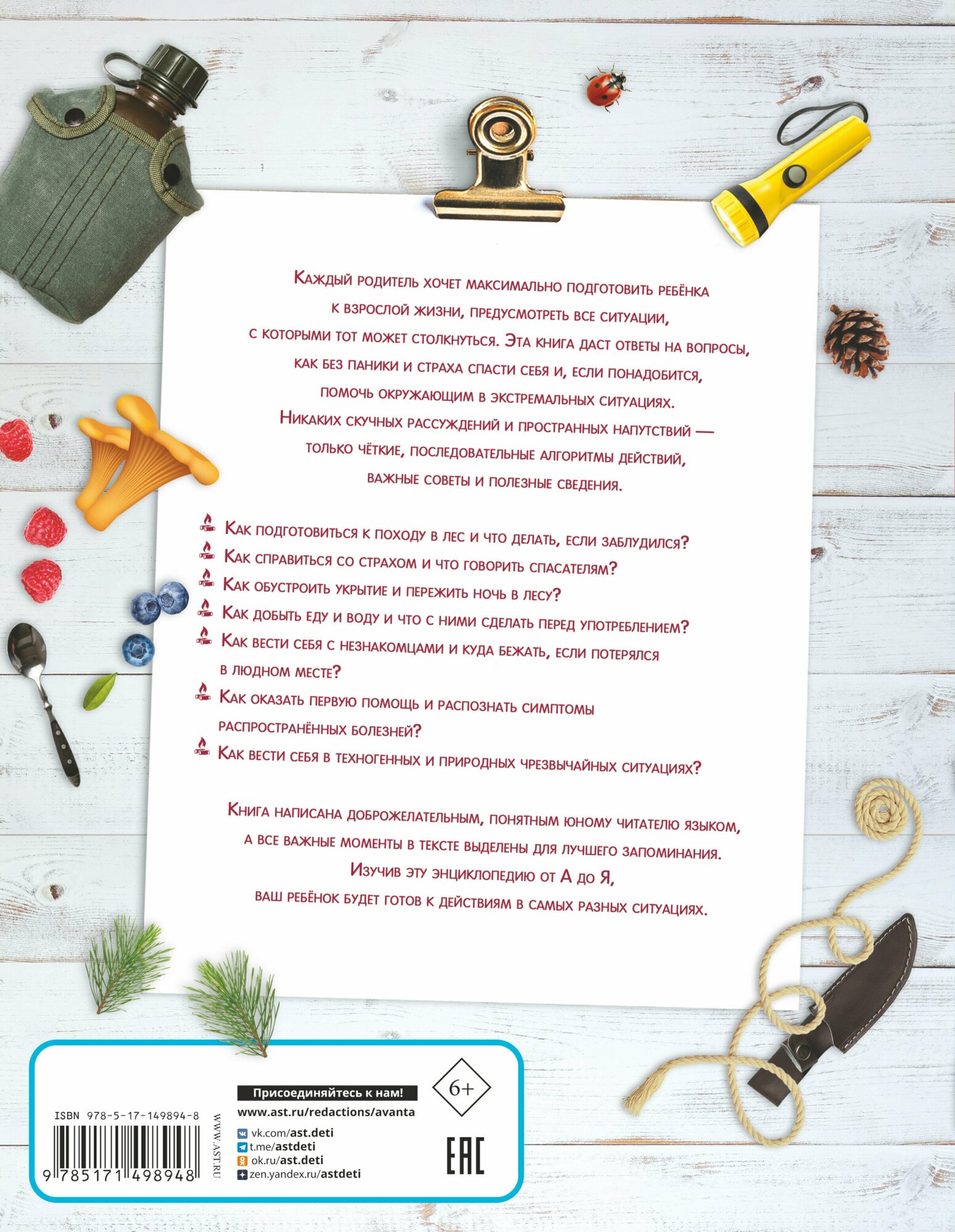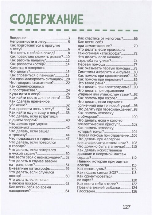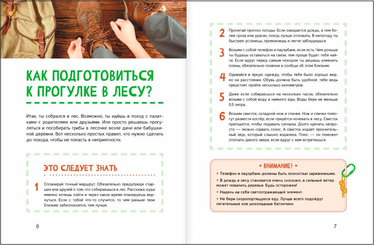 Как подготовиться к походу и что делать, если потерялся в лесу? Где найти еду и как обустроить укрытие? Как справиться со страхом и что сообщить спасателям? Что делать, если началось наводнение или землетрясение? Как вести себя с незнакомцами и что предпринять, если потерялся в незнакомой стране? Как оказывать первую помощь и подавать сигнал SOS?