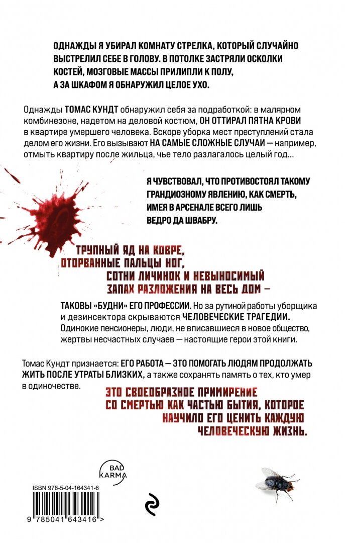 «Дезинфектор и уборщик мест преступлений Томас Кундт выпустил книгу «После смерти прихожу я» и попал прямо в список бестселлеров Spiegel. Его захватывающие истории о местах преступлений, необычных местах в доме, где были найдены тела, и о его работе, которая начинается, когда квартиру покидают полиция и криминалисты, с тех пор восхищают растущую фанатскую базу. Идеально для любителей тру-крайма и черного юмора!»