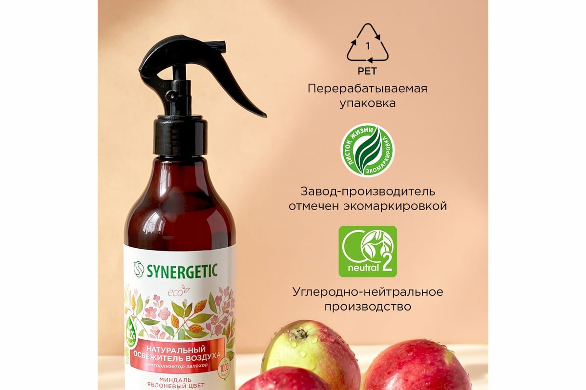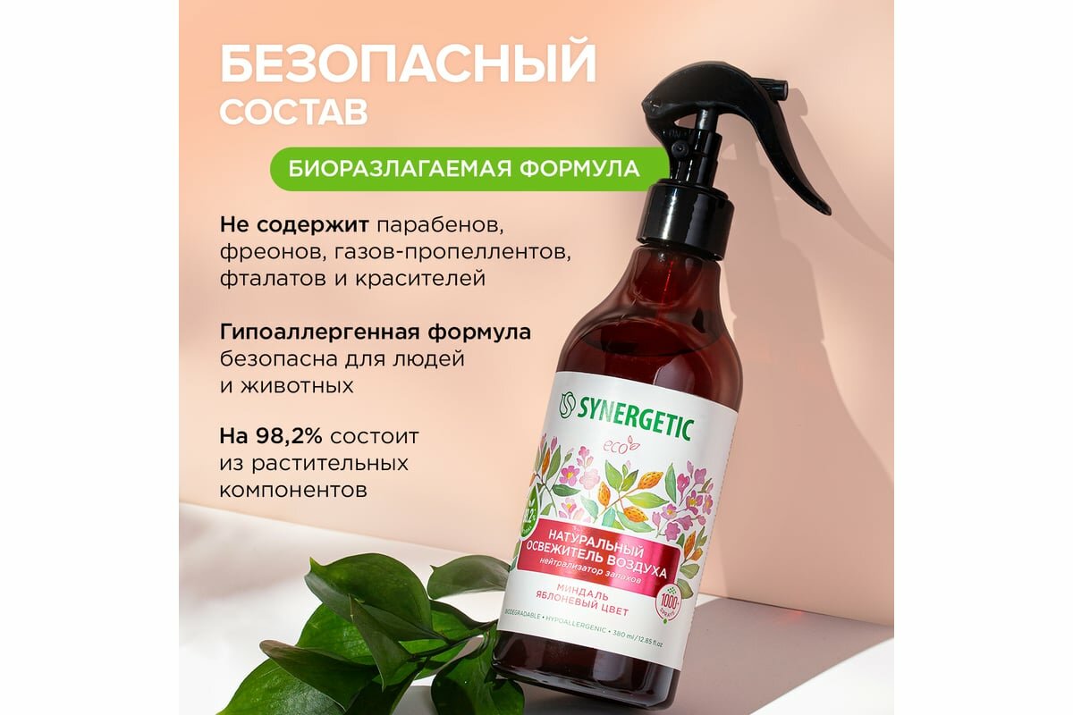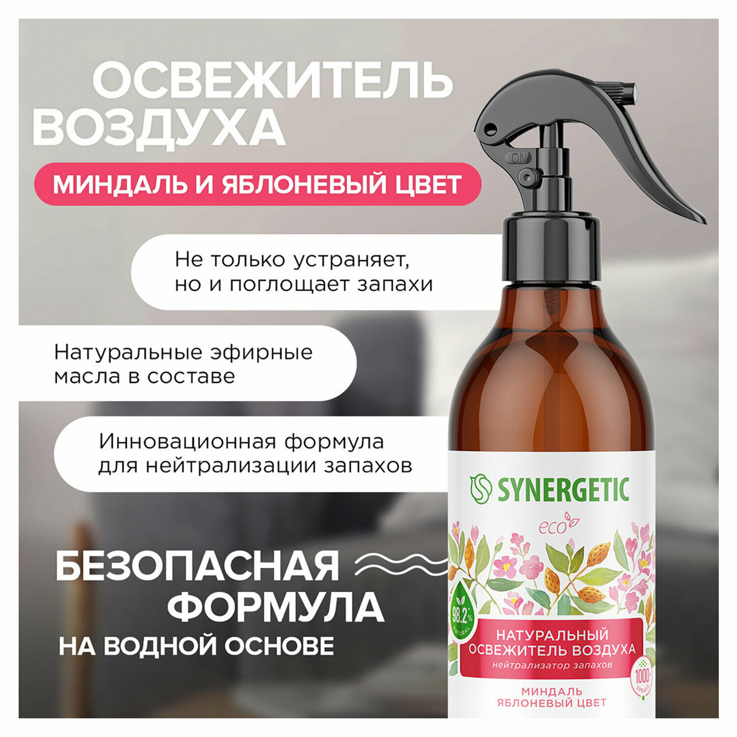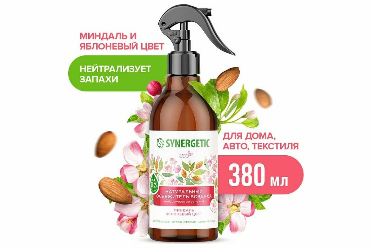 Биоразлагаемый освежитель воздуха, нейтрализатор запахов SYNERGETIC «Миндаль и яблоневый цвет» на водной основе на 98,2% состоит из натуральных компонентов. Парфюмерная композиция с эфирными маслами бергамота, корицы и сандала наполняет воздух сладким цветочным ароматом. Гипоаллергенная формула безопасна для людей и животных. Благодаря 100% натуральному поглотителю запахов — соли полиитаконовой кислоты — освежитель эффективно устраняет стойкие запахи от приготовления пищи, домашних животных, табака и других источников неприятных запахов в гостиной, ванной комнате и санузле, спальне, коридоре, кухне, автомобиле, офисе и прочих помещениях. Подходит для устранения неприятных запахов с тканей (диванов, подушек, ковров, занавесок, простыней, тканевых автокресел, постельного белья), занавесок для душа и спортивных ковриков. Не оставляет следов на поверхностях, увлажняет воздух в помещении и способствует осаждению пыли. Не содержит парабенов, фреонов, газов-пропеллентов, фталатов и красителей.