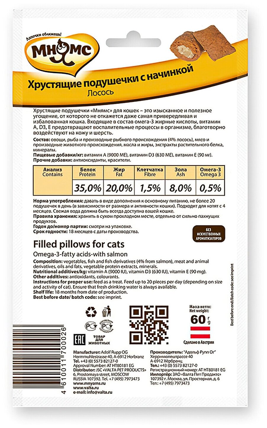 «Мнямс» хрустящие подушечки для кошек с лососем «Здоровье и красота»