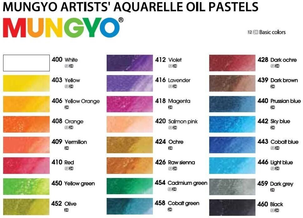 Мелки "Aquarelle Oil Pastel (Extra Soft Water Soluble)" выпускаются корейской компанией "Mungyo", основанной еще в 1946 году. Это экстра-мягкая водорастворимая масляная пастель. Изготавливаются только из нетоксичных сертифицированных материалов и пигменов, обладающих высокой светостойкостью. Цветовой спектр включает в себя 24 тщательно подобранных чистых оттенка. Этими масляными акварельными мелками можно рисовать как обычной пастелью - они прекрасно ложатся и мягко растушёвываются, а можно размыть штрихи влажной кистью, получив эффект работы акварельной краской.