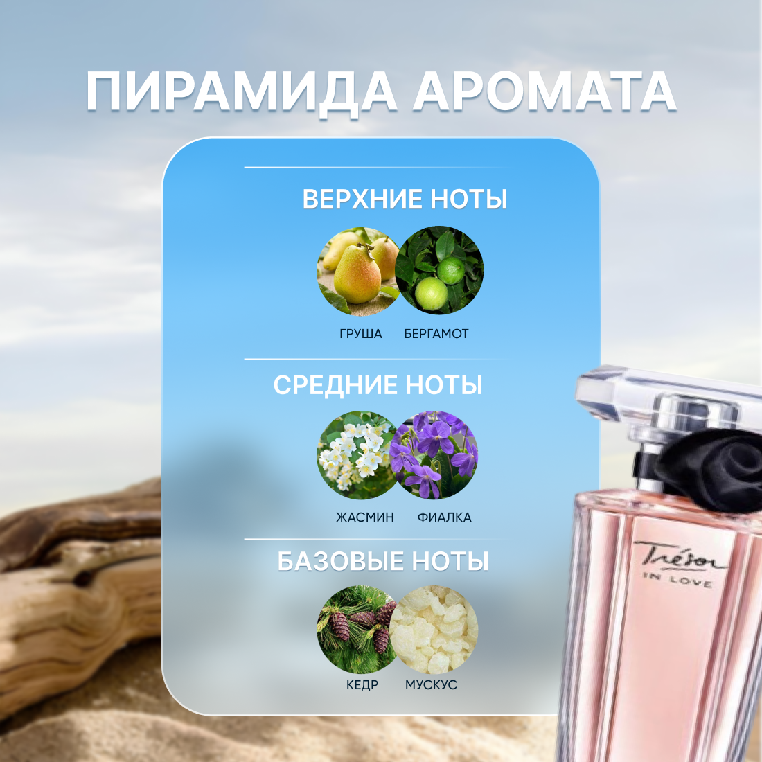 Tresor In Love чувственный аромат от Lancome, который специально разработан известными парфюмерами Домиником Ропионом и Вероникой Ниберг для соблазнительных женщин. Композицию открывают свежие ноты нектарина, стойкого бергамота, медового персика и пикантной кислой груши. В центре аромата расцветают волнующие ноты изящной турецкой розы и душистого жасмина. Ноты теплого кедра создают роскошный шлейф композиции.