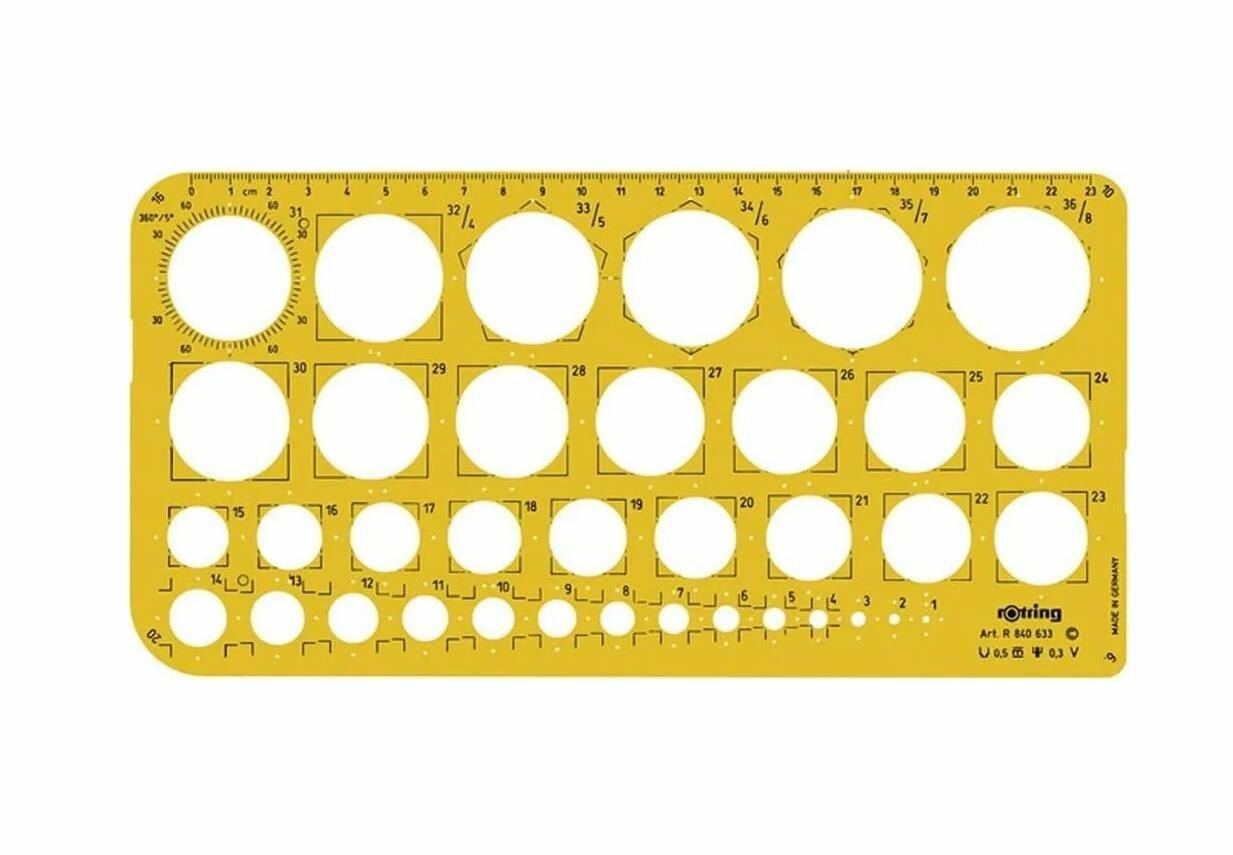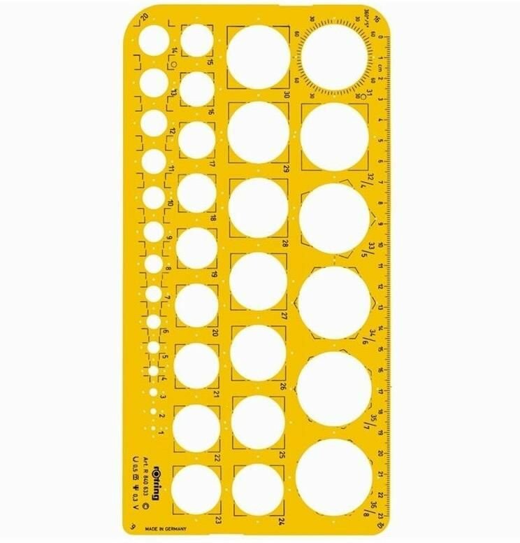 | Описание | Rotring трафареты окружностей. Окружности диаметром 1–36 мм с шагом в 1 мм. С многоугольниками и транспортиром. Радиусы 6, 10, 16, 20 мм. С миллиметровой линейкой и держателем.255 x 129 х 1.6 мм. |