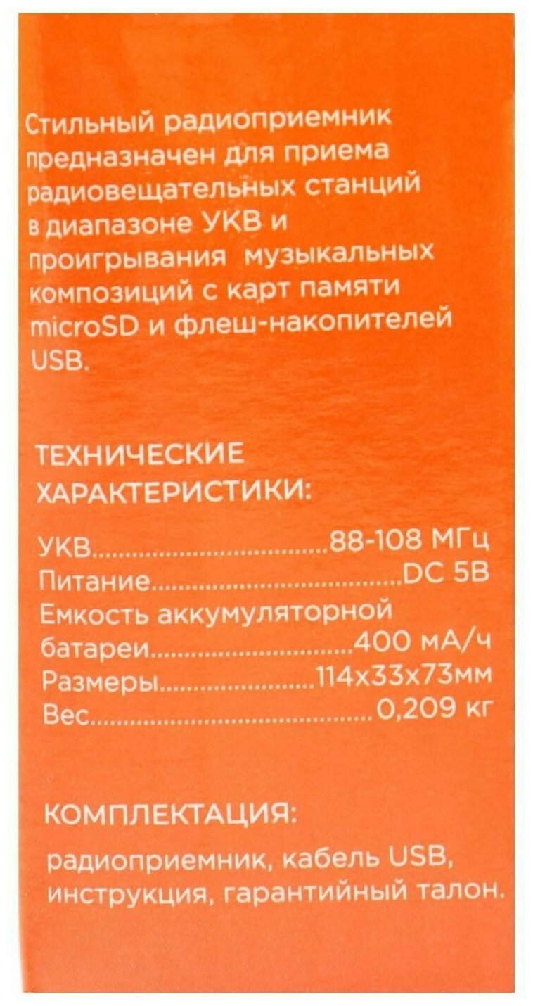 Очень хороший звук, маленький и лёгкий, хорошо ловит, простейший в управлении. Можно слушать музыку с флешки и через наушники.