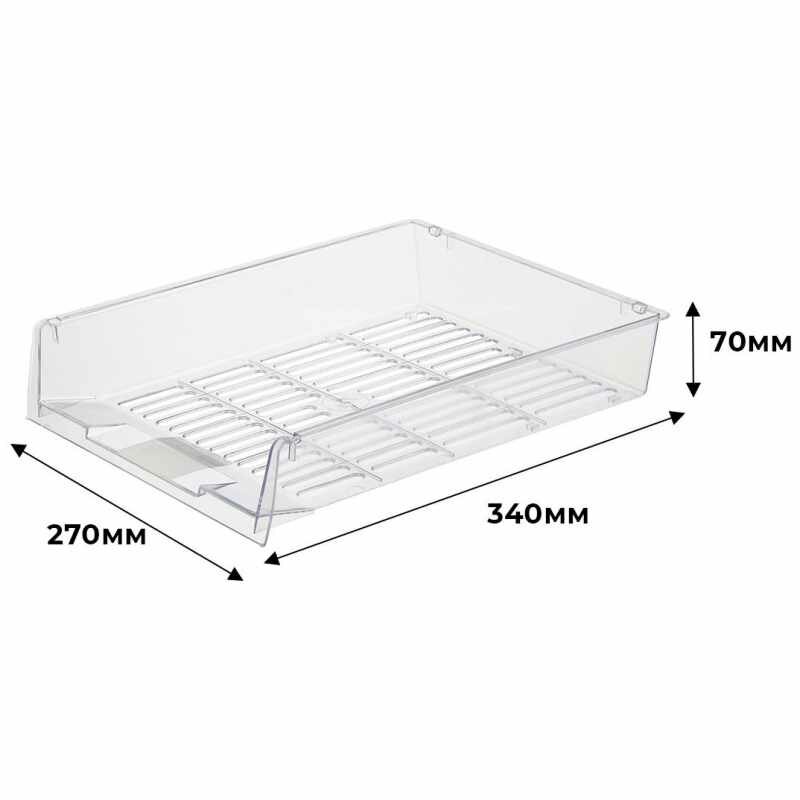 Горизонтальный лоток для бумаг Attache предназначен для хранения документов и печатной продукции формата А4. Решетчатое дно. Возможна установка друг на друга (штабелирование). Изготовлен из полистирола. Цвет: бесцветный. Размеры: 340х270х70 мм. Вес: 0.23 кг. В комплекте нет этикетки для маркировки.