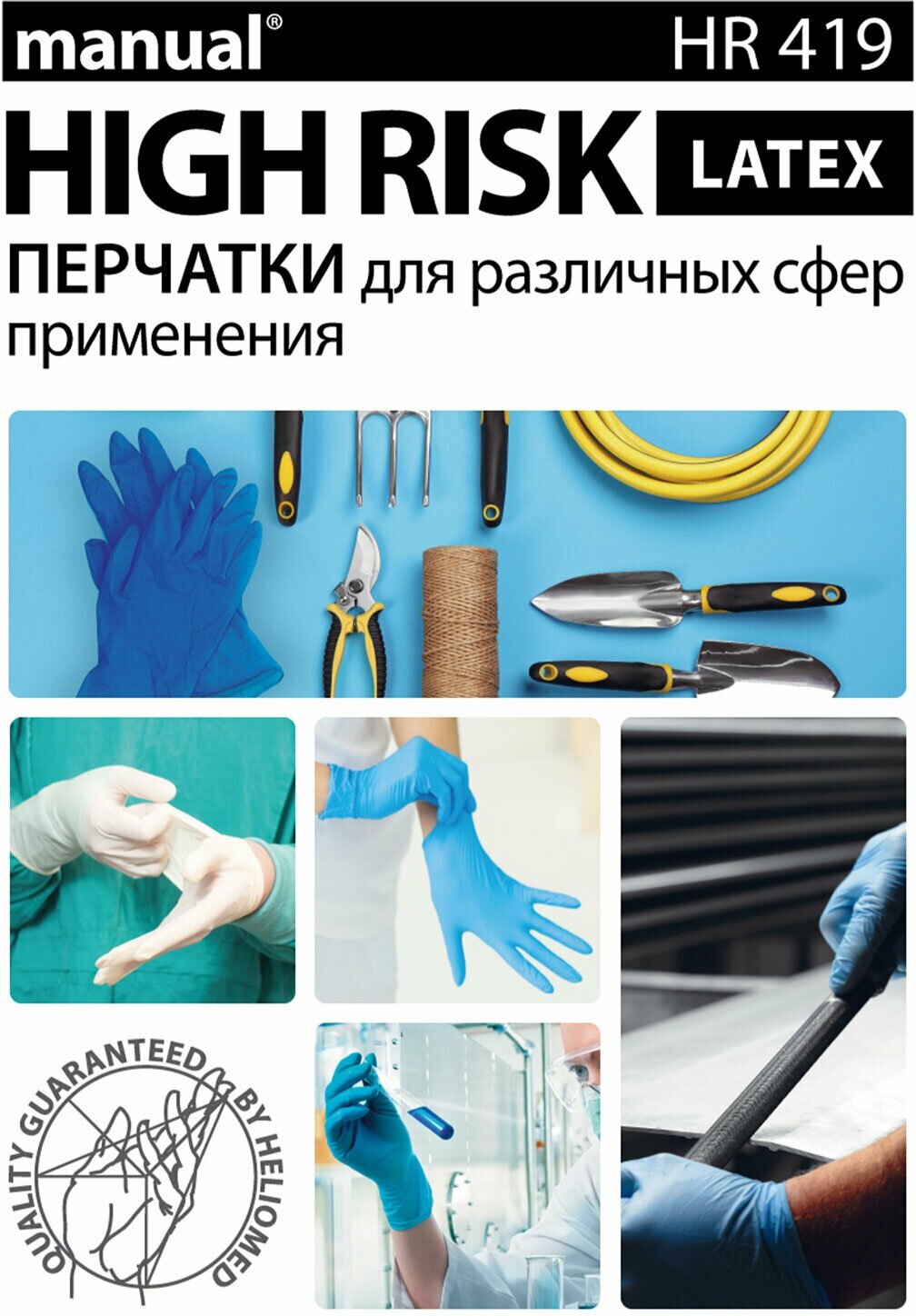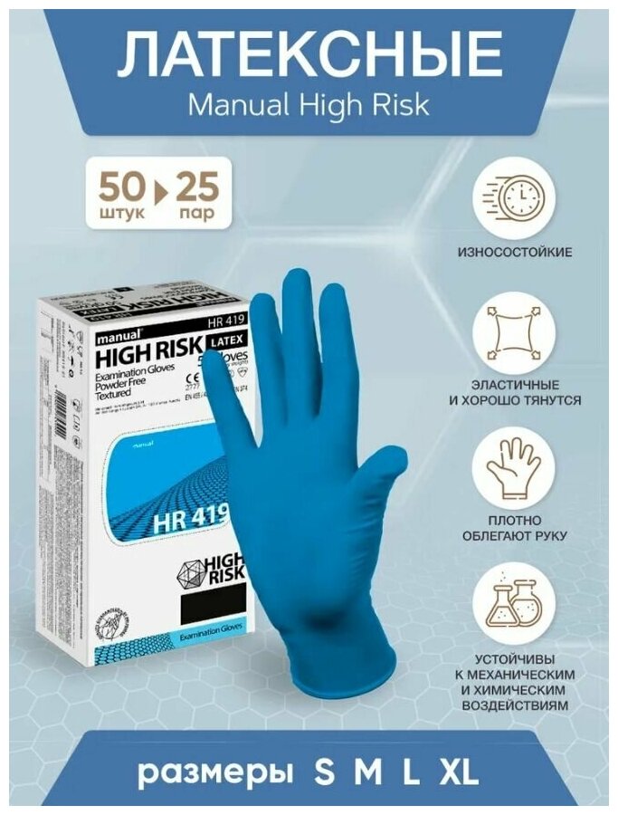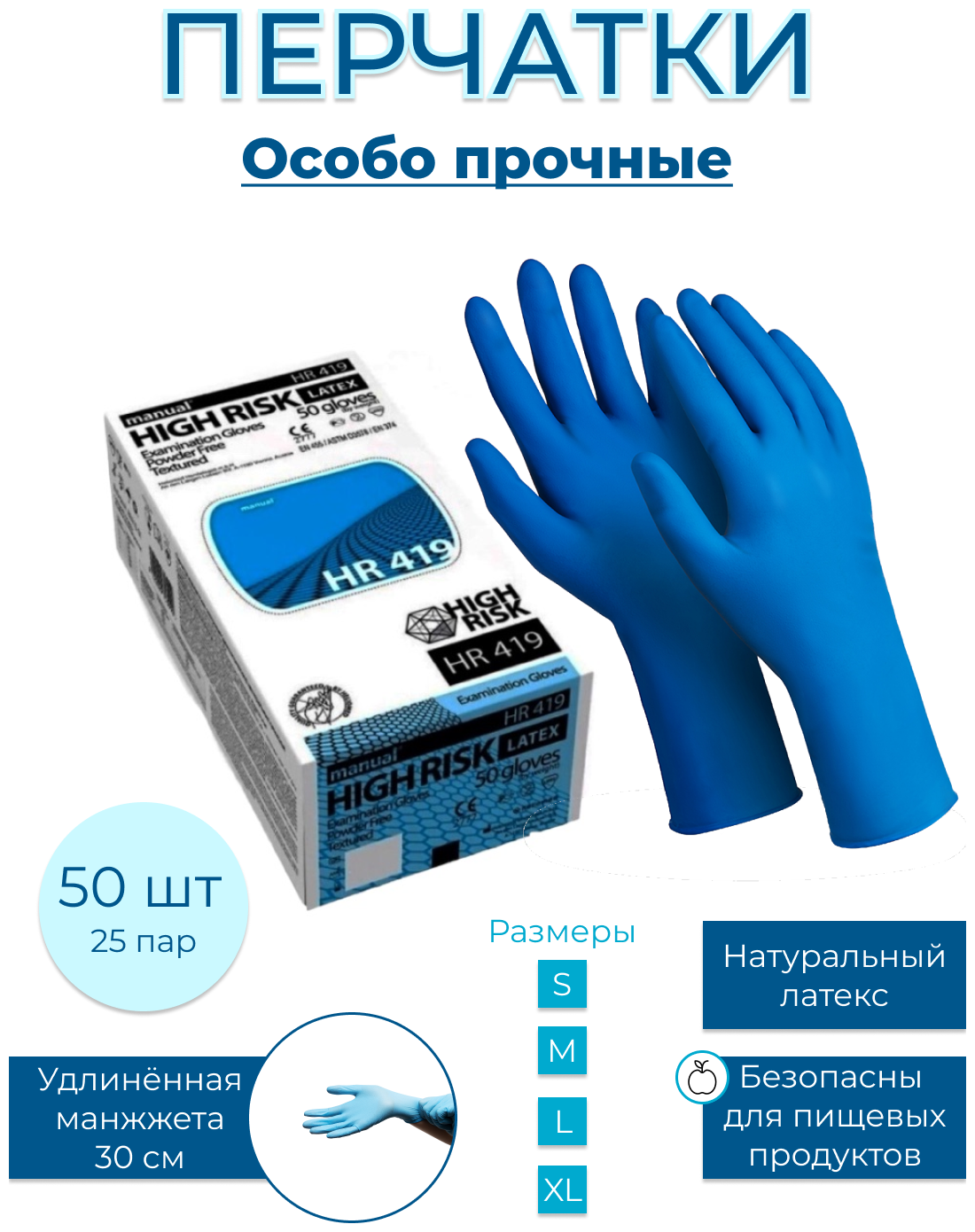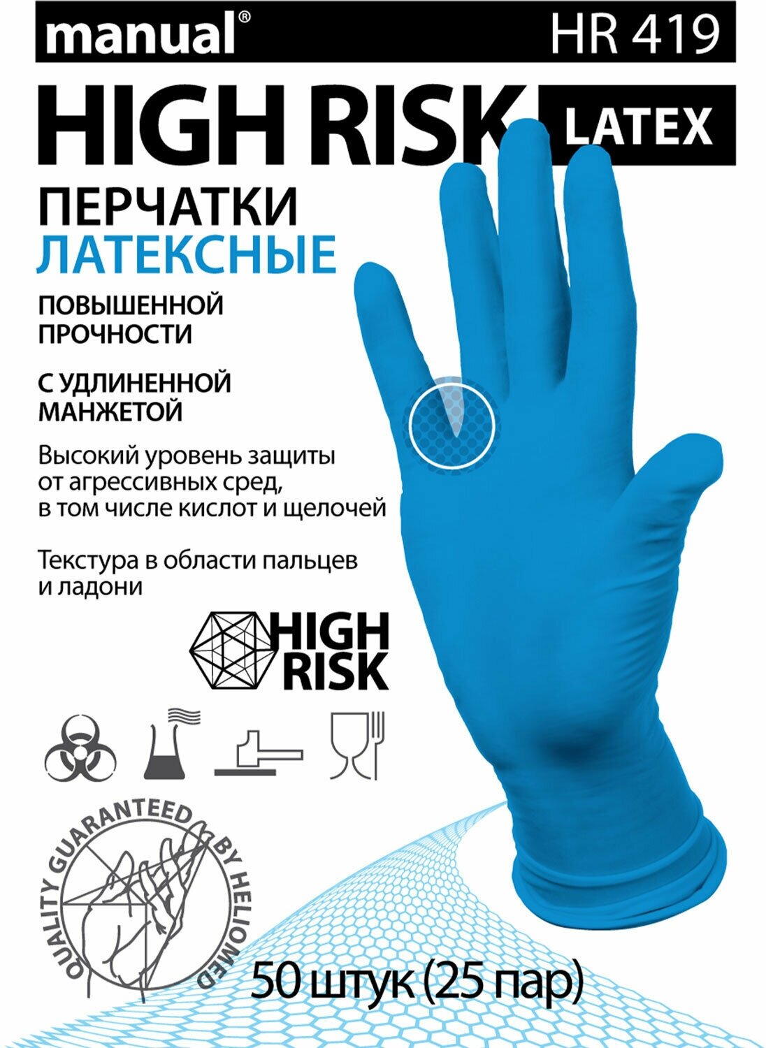 Латексные неопудренные нестерильные одноразовые перчатки особой прочности с текстурированной поверхностью в области пальцев и ладони High Risk устойчивы к механическим повреждениям и имеют высокий уровень защиты от воздействия химически агрессивных сред. Удлиненная манжета от 280 мм для более надежной защиты предплечья. Предназначены для использования в качестве средства индивидуальной защиты рук. Размер: 8, М. Количество штук в упаковке: 50 штук/25 пар в упаковке. Недопустимо использование при нарушении целостности перчаток. Недопустимо использование перчаток несоответствующего размера. Не рекомендуется длительное (более 2-х часов) ношение перчаток. При частом и длительном ношении перчаток рекомендуется соответствующий уход за кожей рук. Перчатки изготовлены из натурального латекса, который может вызвать аллергические реакции у отдельных лиц. При наличии аллергии на натуральный латекс необходимо использовать перчатки из синтетических материалов. Возможна индивидуальная непереносимость материалов. При появлении раздражения кожи прекратите использовать перчатки и обратитесь за консультацией к врачу. Возможно проявление дерматитов и иных кожных раздражений как следствие неправильного ухода за кожей рук и жестких условий изоляции кожи рук от естественной вентиляции воздухом. Не обеспечивают гарантированной защиты от проколов и порезов. Хранить в сухом месте при температуре 5C-40C. Избегать воздействия горюче-смазочных материалов и растворителей, озона и прямого солнечного света. Имеется регистрационное удостоверение на медицинское изделие.