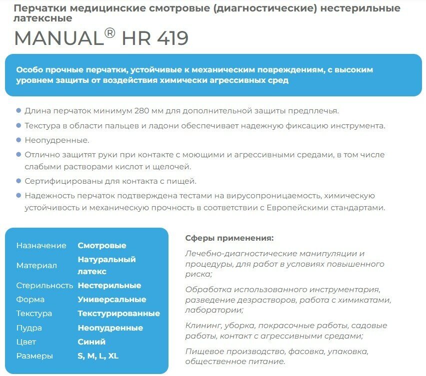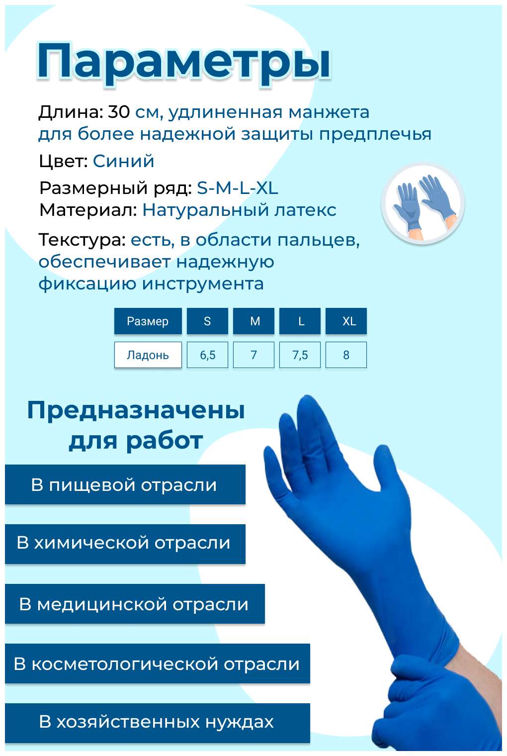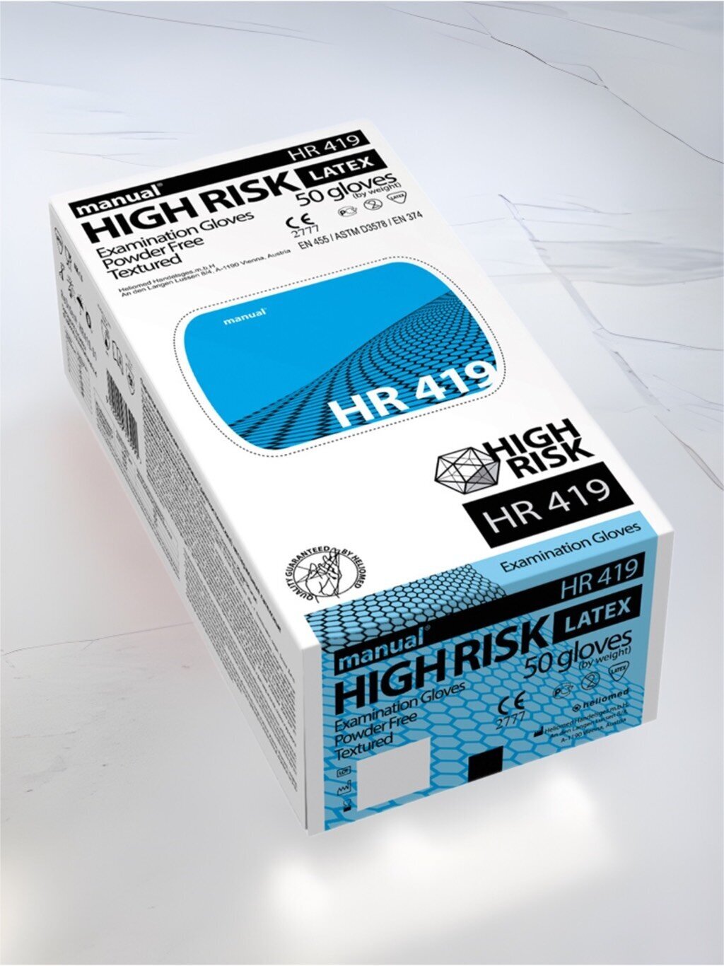 Латексные неопудренные нестерильные одноразовые перчатки особой прочности с текстурированной поверхностью в области пальцев и ладони High Risk устойчивы к механическим повреждениям и имеют высокий уровень защиты от воздействия химически агрессивных сред. Удлиненная манжета от 280 мм для более надежной защиты предплечья. Предназначены для использования в качестве средства индивидуальной защиты рук. Размер: 8, М. Количество штук в упаковке: 50 штук/25 пар в упаковке. Недопустимо использование при нарушении целостности перчаток. Недопустимо использование перчаток несоответствующего размера. Не рекомендуется длительное (более 2-х часов) ношение перчаток. При частом и длительном ношении перчаток рекомендуется соответствующий уход за кожей рук. Перчатки изготовлены из натурального латекса, который может вызвать аллергические реакции у отдельных лиц. При наличии аллергии на натуральный латекс необходимо использовать перчатки из синтетических материалов. Возможна индивидуальная непереносимость материалов. При появлении раздражения кожи прекратите использовать перчатки и обратитесь за консультацией к врачу. Возможно проявление дерматитов и иных кожных раздражений как следствие неправильного ухода за кожей рук и жестких условий изоляции кожи рук от естественной вентиляции воздухом. Не обеспечивают гарантированной защиты от проколов и порезов. Хранить в сухом месте при температуре 5C-40C. Избегать воздействия горюче-смазочных материалов и растворителей, озона и прямого солнечного света. Имеется регистрационное удостоверение на медицинское изделие.
