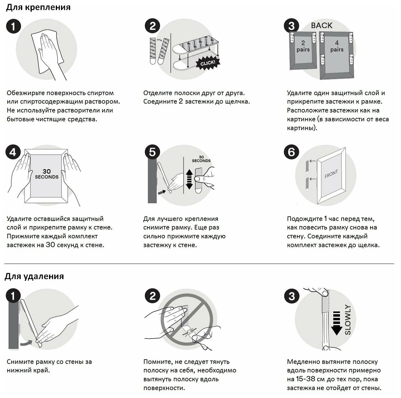 Command™ - это уникальная адгезивная технология для легкого, надежного и безопасного крепления разнообразных аксессуаров на вертикальной поверхности. Данная система позволяет организовать пространство без применения инструментов и не повреждая поверхности. При необходимости можно удалить, потянув за клейкую полоску. Благодаря настенным застежкам Command любое помещение легко декорируется картинами и плакатами. Все изображения, зафиксированные настенными застежками, легко заменяются, т. к. при снятии картины нет необходимости удалять с поверхности сам крепеж. Одна застежка фиксируется на стене, а другая - на раме. Именно поэтому Вы можете вешать и снимать Ваши фотографии и другие малые декоративные предметы так часто, как пожелаете. Максимальная нагрузка: 5,4 кг на упаковку. Подходит для крепления рамок и картин, настенных часов, домофонов, роутеров, крючков. Для надежности сцепления с поверхностью, перед монтажом рекомендуем обработать поверхность специальной салфеткой пропитанной праймером 94EF артикул 06396. Эта салфетка в разы увеличивает силу и скорость набора адгезии на всех, в том числе низкоэнергетических поверхностях.Преимущества:Легко крепится Держит крепко Удаляется без следаБез применения инструментовНе повреждает поверхностьСоблюдайте инструкцию по применению. Идеально подходит для твердых, ровных поверхностей и окрашенных стен. Не подходит для неокрашенных бумажных или виниловых обоев, шероховатых поверхностей.Запрещается вешать предметы над кроватью и использовать с антиквариатом и иными ценными вещами. Запрещается использовать на нежных обоях. Возможно не очень хорошее крепление на некоторых виниловых обоях. Использовать при температуре от +10 до +40.Для надежного крепления необходимо следовать инструкции на обороте упаковки.