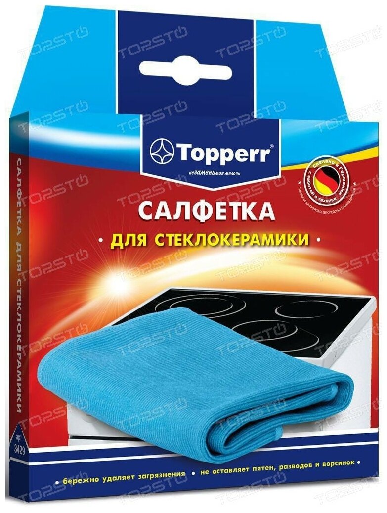 Как очистить плиту из стеклокерамики в домашних условиях? Чем очистить стеклокерамику от нагара? Если вы задавались этими вопросами, то наверняка знаете, что обычная тряпка и обычные чистящие порошки способны только испортить поверхность. Вам нужны профессиональные средства.Салфетка TOPPERR 3429 для стеклокерамики разработана специально с учетом рекомендаций крупнейших производителей бытовой техники. Предназначена для бережной и эффективной очистки стеклокерамической поверхности от пыли и пятен.Чистка стеклокерамики стала еще проще с салфетками Topperr. Очистить плиту и пригоревшую стеклокерамику можно в считанные минуты!Салфетки для стеклокерамики Topperr 3429:Придают блеск поверхности.Бережно удаляют загрязнения.Не оставляют пятен, разводов и ворсинок.Состав: 80% Polyester, 20% Polyamide.Способ применения:Перед использованием отключите стеклокерамическую панель и дождитесь пока она остынет.Смочите часть салфетки водой и протрите обрабатываемую поверхность.Затем сухой стороной салфетки протрите и отполируйте поверхность.Готово! Теперь вы знаете как почистить плиту из стеклокерамики.«Чем почистить варочную поверхность из стеклокерамики» - это не вопрос, если у вас есть Topperr!