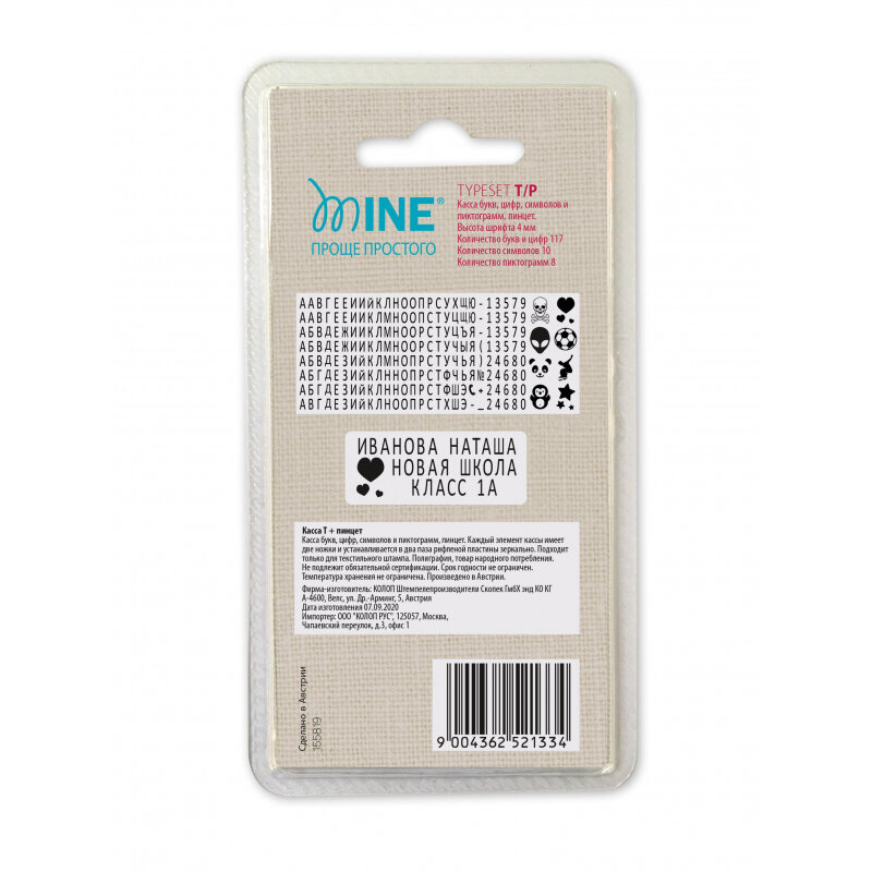 Касса букв, цифр, символов и пиктограмм TYPE SET T/P подходит только для текстильного штампа (артикул 868542). Каждый элемент кассы имеет две ножки и устанавливается в два паза рифленой пластины зеркально. Высота шрифта: 4 мм. В комплекте: касса, пинцет.