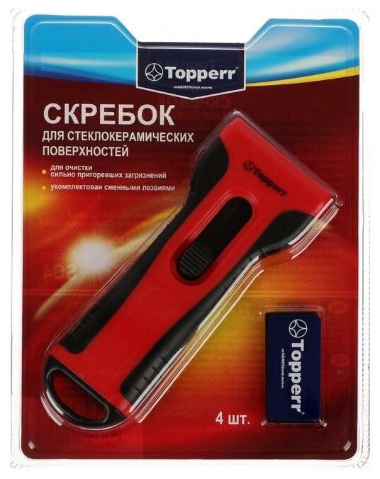 Скребок служит для очистки сильных и пригоревших загрязнений со стеклокерамических поверхностей.Укомплектован лезвием из высококачественной стали.После работы для Вашей безопасности лезвие убирается внутрь корпуса скребка.Имеет дополнительный блок лезвий х4шт.Способ применения:сдвиньте защитный фиксатор по направлению «от себя» на одно деление. Установив скребок под 30 градусов к поверхности, аккуратно очистите пригоревшие загрязнения горизонтальными движениями. Пятна от сахара, сиропов, варенья, удалять скребком немедленно. После завершения чистки сдвиньте защитную пластину по направлению «к себе» до упора.внимание: для безопасной транспортировки лезвие установлено тупой стороной, перед началом эксплуатации переверните его. Замена лезвия: сдвиньте защитный фиксатор по направлению «от себя» до упора. Аккуратно извлеките лезвие двигая его в сторону и замените новым. Сборку производите в порядке, обратном разборке.Рекомендуется использовать сменные лезвия TOPPERR (артикул 1310 SC5)
