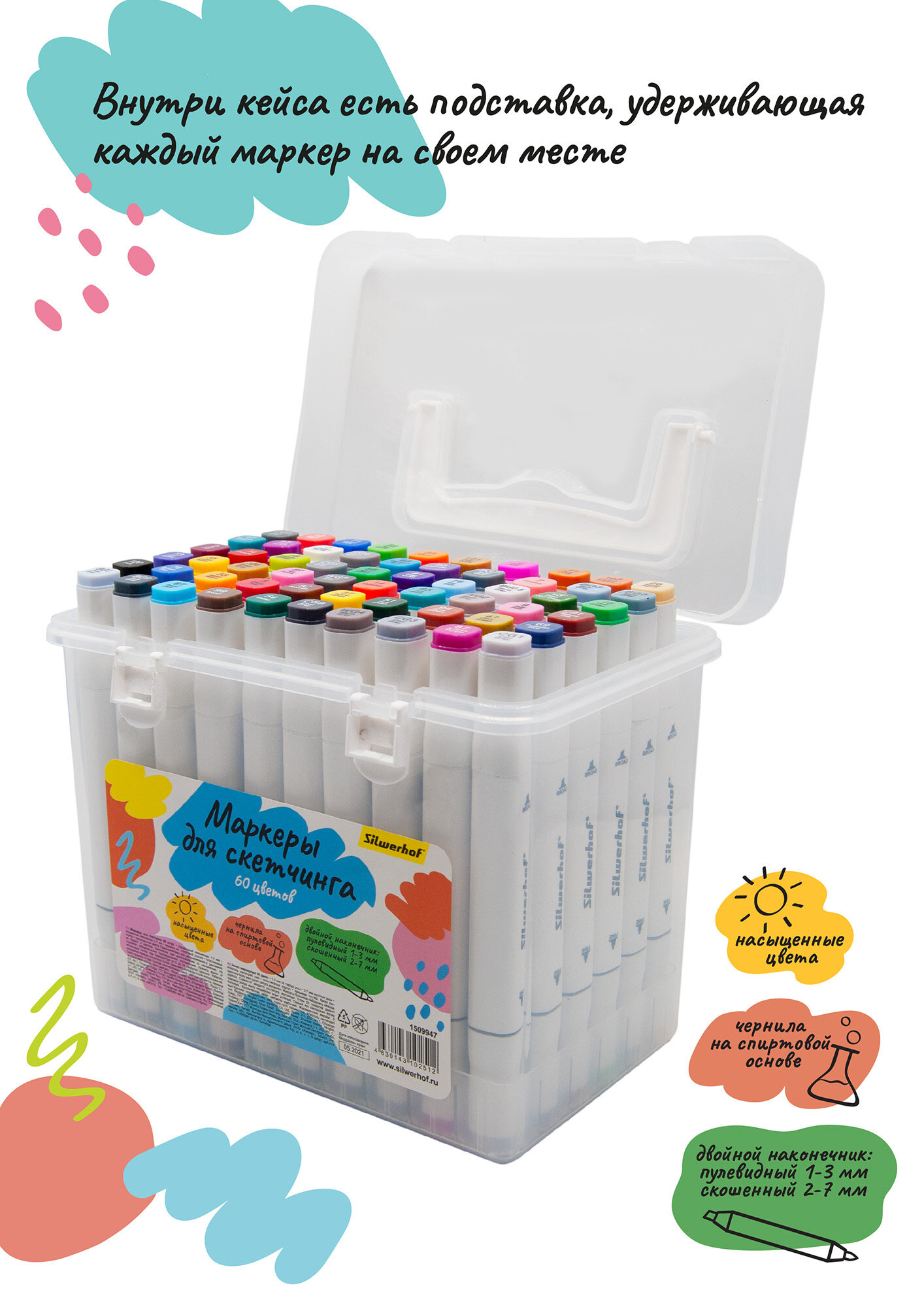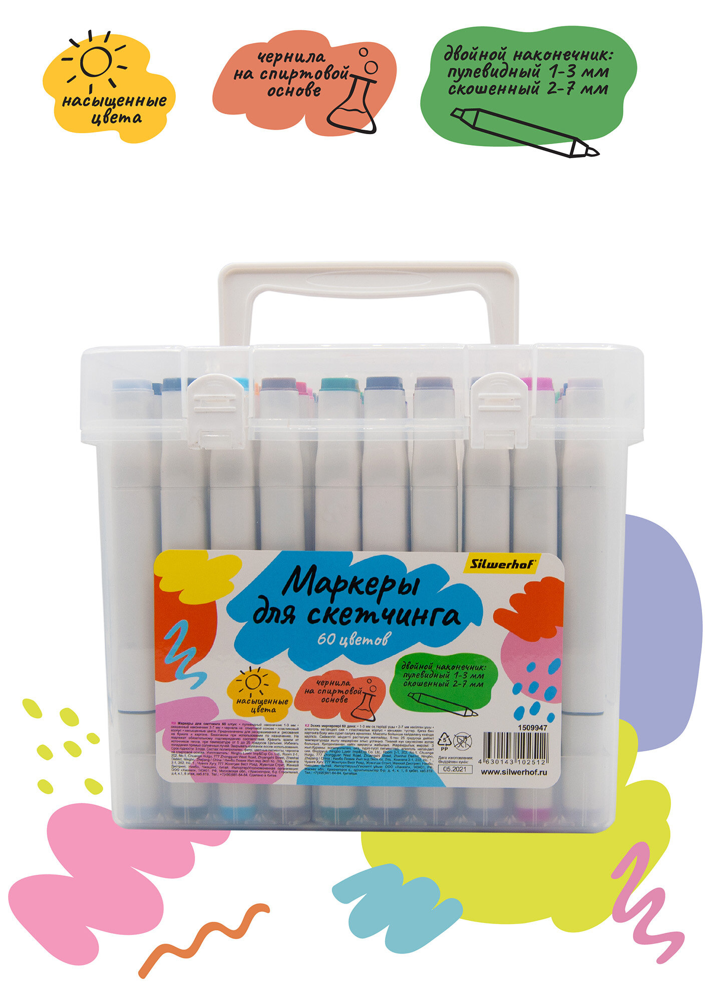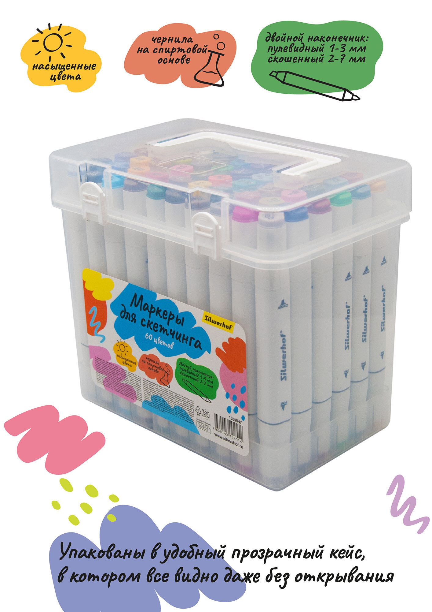 Набор маркеров для скетчинга Silwerhof, с двойным пишущим наконечником диаметром 1-7мм, 60цв., пластиковая коробка, в упаковке 60шт.