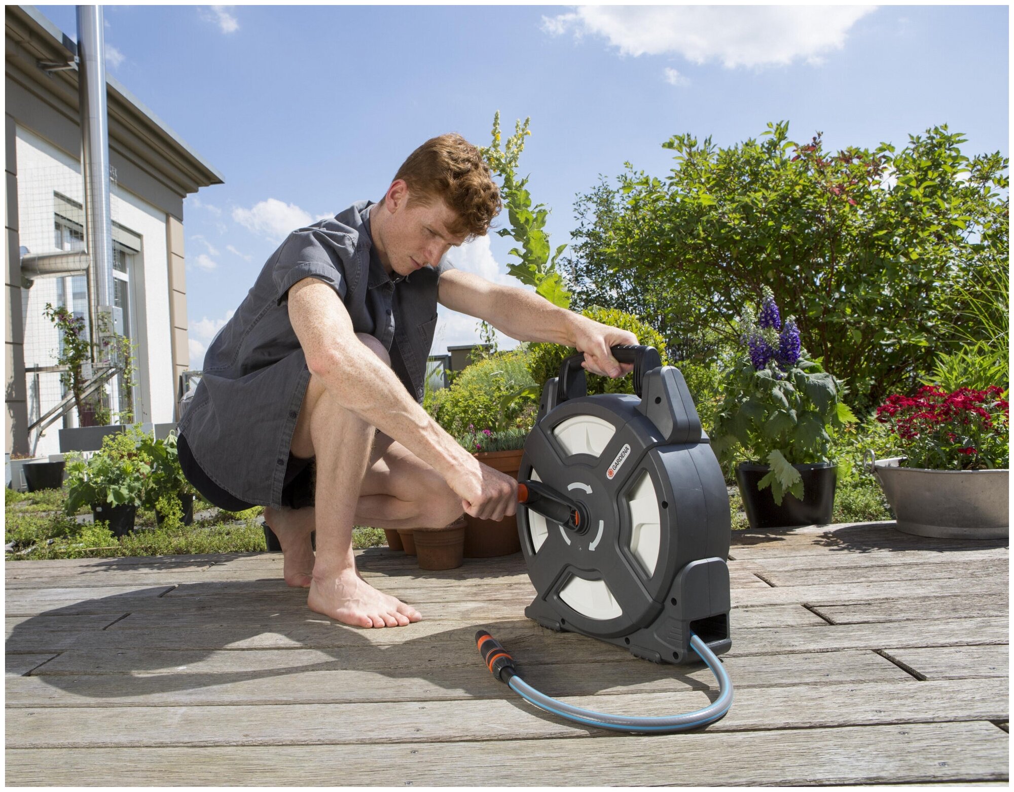 Катушка для террас Gardena имеет 10-метровый шланг, его можно компактно хранить и легко транспортировать.
