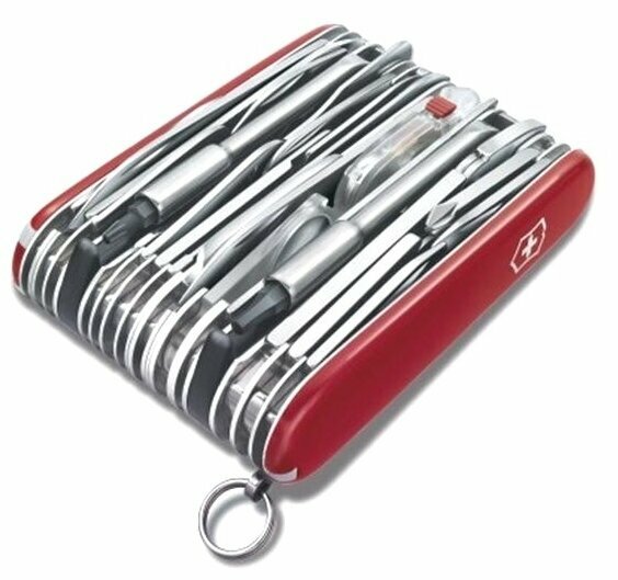 | Инструменты (функции) | 1. Большое лезвие2. Малое лезвие3. Штопор4. Консервный нож с5. - Малой отвёрткой6. Открывалка для бутылок с7. - Отвёрткой8. - Инструментом для снятия изоляции9. Шило, кернер10. Кольцо для ключей11. Пинцет12. Зубочистка13. Ножницы14. Многофункциональный крючок15. Пила по дереву16. Инструмент для чистки рыбы с17. - Инструментом для извлечения рыболовного крючка18. - Линейкой (сантиметры)19. - Линейкой (дюймы)20. Пилка для ногтей с21. - Напильником по металлу22. - Инструментом для ухода за ногтями23. - Пилой по металлу24. Тонкая отвёртка25. Стамеска26. Плоскогубцы с27. - Кусачками для проводов28. - Инструментом для обжима проводов29. Крестовая отвёртка30. Лупа31. Шариковая ручка32. Булавка из нержавеющей стали33. Мини-отвёртка34. Фармацевтическая лопатка35. Лезвие для обрезки ветвей деревьев36. Нож электрика со37. - Скребком для проволоки38. Ключ с39. - Гнездом под шестигранники 5 мм для D-SUB40. - Гнездом под шестигранники 4 мм для бит41. - Битой «звёздочка» Torx 842. - Шестигранной битой Hex 4 мм43. Держатель для насадок с44. - Крестовой битой Philips 045. - Крестовой битой Philips 146. - Крестовой битой Philips 247. - Узкой битой 4 мм48. - Битой «звёздочка» Torx 1049. - Битой «звёздочка» Torx 1550. Ключ с51. - Гнездом под шестигранники 5 мм для D-SUB52. - Гнездом под шестигранники 4 мм для бит53. - Шестигранной битой Hex 254. - Шестигранной битой Hex 2,555. Держатель для насадок с56. - Битой «звёздочка» Torx 657. - Битой «звёздочка» Torx 858. - Узкой битой 3 x 159. - Узкой битой 4 x 160. - Шестигранной битой Hex 1,261. - Шестигранной битой Hex 1,562. Большое лезвие с волнистой кромкой63. Светодиод64. Универсальный гаечный ключ M3, M4, M565. Многофункциональный крючок с66. - Пилкой для ногтей67. Шило, кернер, универсальный инструмент с68. - Открывалкой для бутылок69. - Консервным ножом70. - Отвёрткой71. - Инструментом для снятия изоляции72. Инструмент для вскрытия часов73. Тонкая отвёртка |
