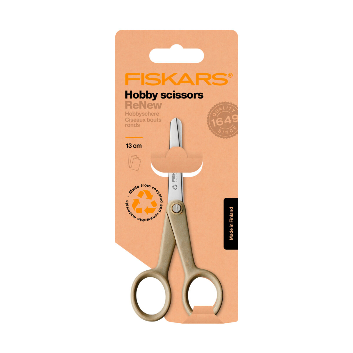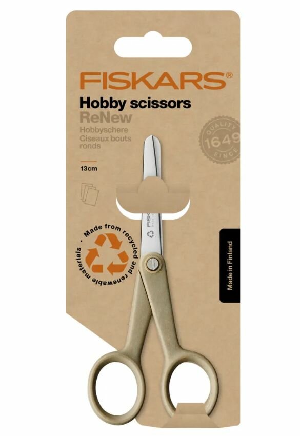 Ножницы Fiskars ReNew для хобби изготовлены из переработанных (80%) и возобновляемых (13%) материалов. Экологически чистое производство в Финляндии. Ножницы для хобби имеют лезвия, безопасные для детей, и их можно хранить в карманах и в любом месте дома. Лезвия из переработанной (85-95%) нержавеющей стали имеют тупые концы для дополнительной безопасности. Ручка эргономичной формы изготовлена из переработанного пластика (66% бытовых отходов упаковки) и возобновляемого целлюлозного волокна (34%). Ножницы подлежат 100% вторичной переработке. Длина: 13 см. Для правшей и левшей. Каждая пара уникальна: Из-за использования экологически чистых, переработанных материалов окраска и внешний вид ручек ножниц могут варьироваться, что делает каждую пару ножниц совершенно уникальной! Поэтому ножницы из вторичного сырья могут иметь, например, слегка коричневый или зеленый оттенок или несколько пестрый вид. Светло-коричневые пятна характерны для возобновляемых целлюлозных волокон. Созданные из любви к природе и стремления к ее сохранению, большие универсальные ножницы Fiskars ReNew - это экологичный и продуманный выбор, они изготовлены из переработанных (80%) и возобновляемых (13%) материалов и на 100% подлежат переработке. Отлично подходят для большинства домашних задач. Длинные прочные лезвия изготовлены из переработанной нержавеющей стали и имеют прецизионную заточенную кромку, которая дольше остается острой и позволяет резать несколько слоев обычных материалов. Эргономичная ручка из переработанного пластика и возобновляемой целлюлозы обеспечивает исключительный комфорт и контроль. Ножницы ReNew производятся в Финляндии используя экологически безопасные методы. Для упаковки используется 100% переработанная бумага, пригодная для вторичного использования.