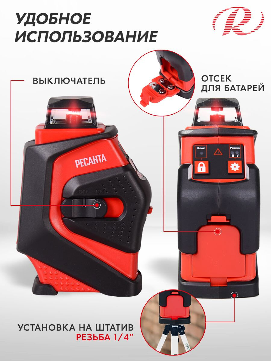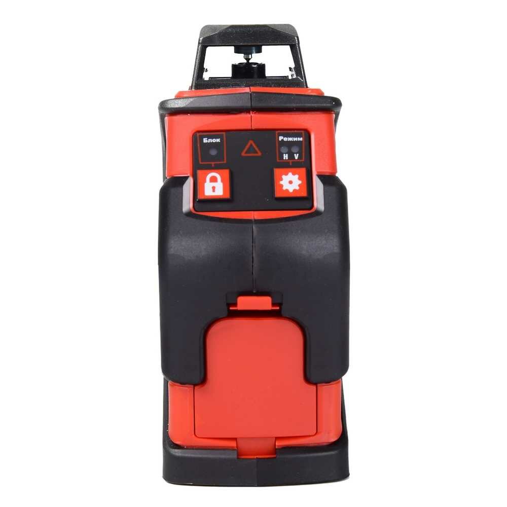 Прибор оснащен индикаторами режима работы, отклонения уровня (более 4°), работы без автоматического самонивелирования. В комплекте 4 батарейки типа АА.