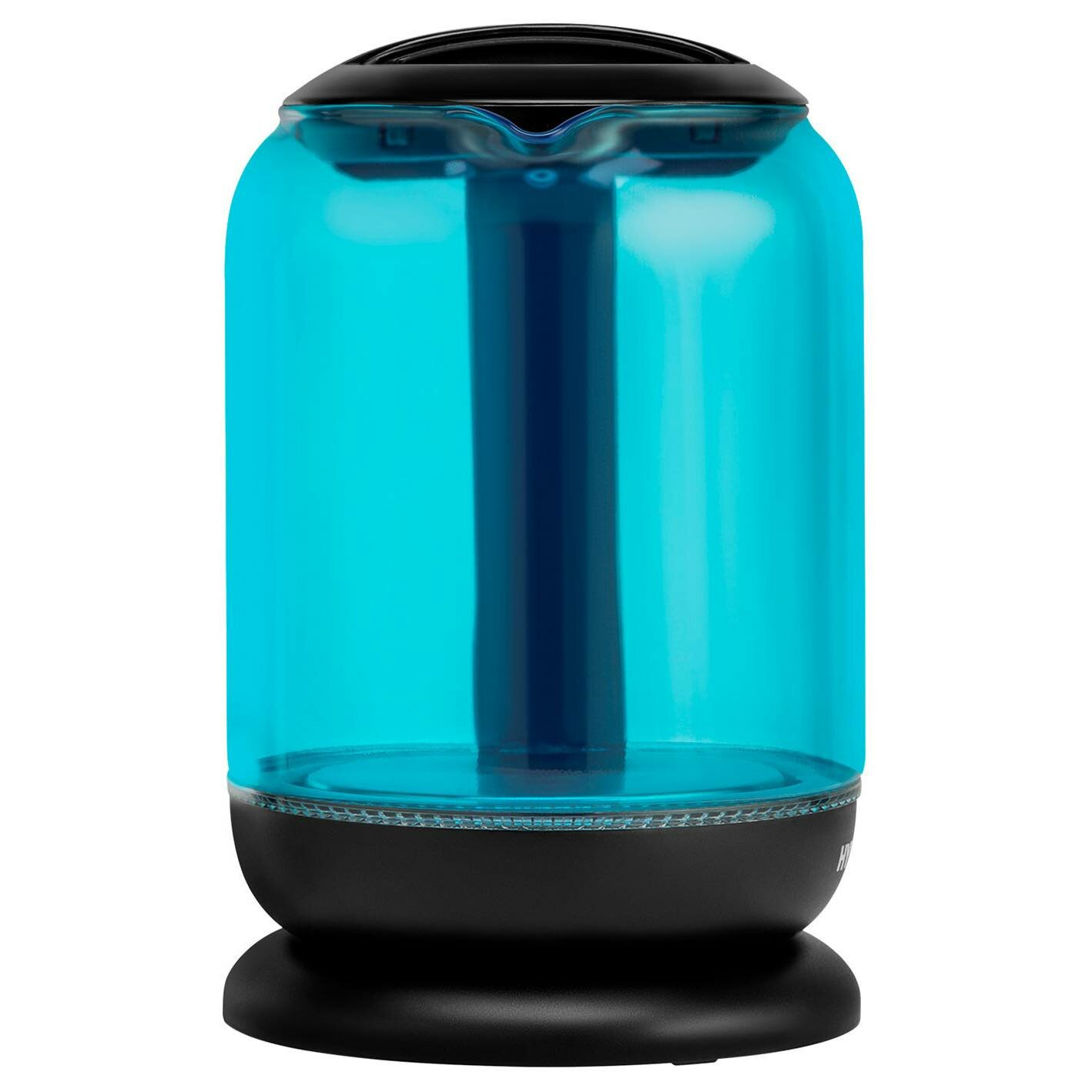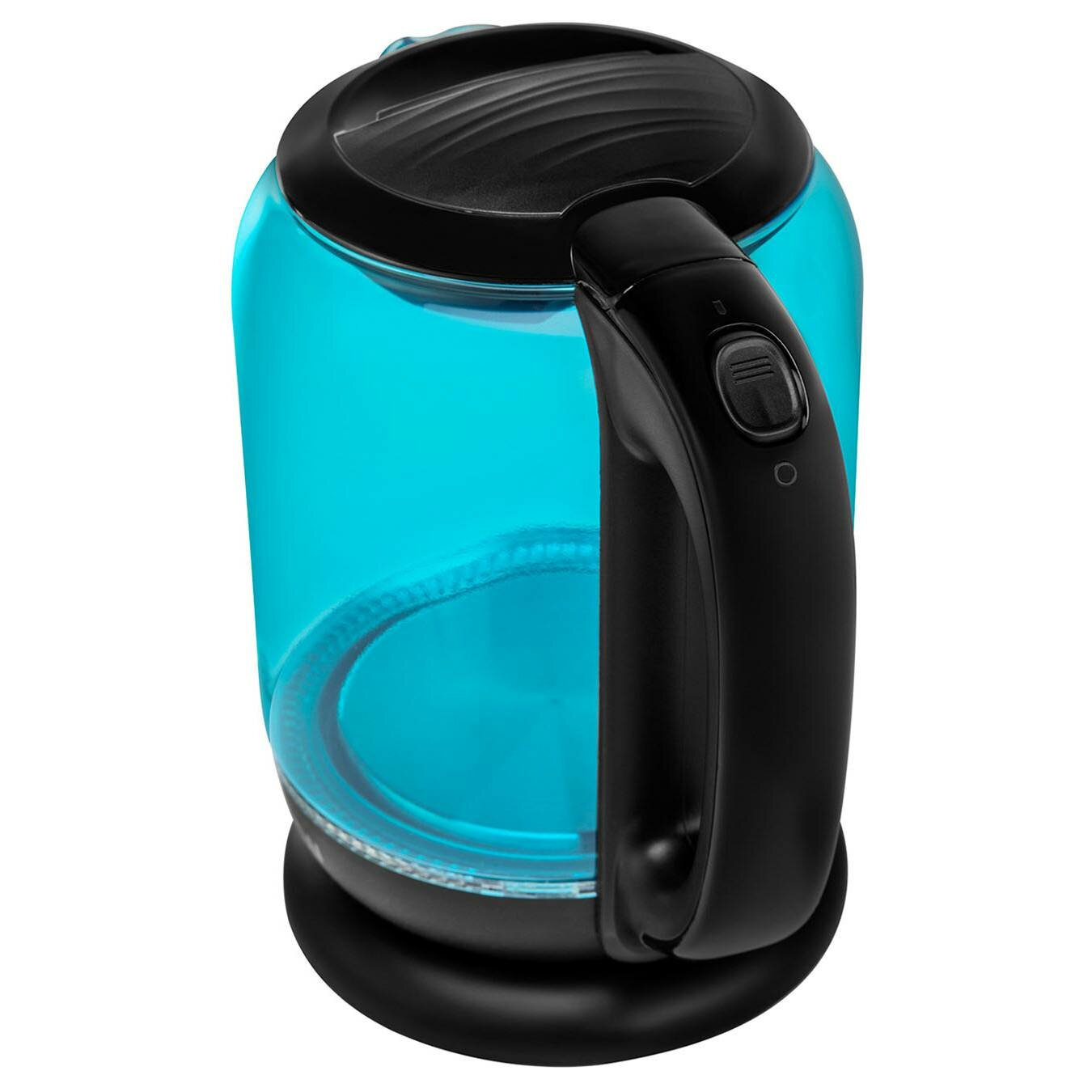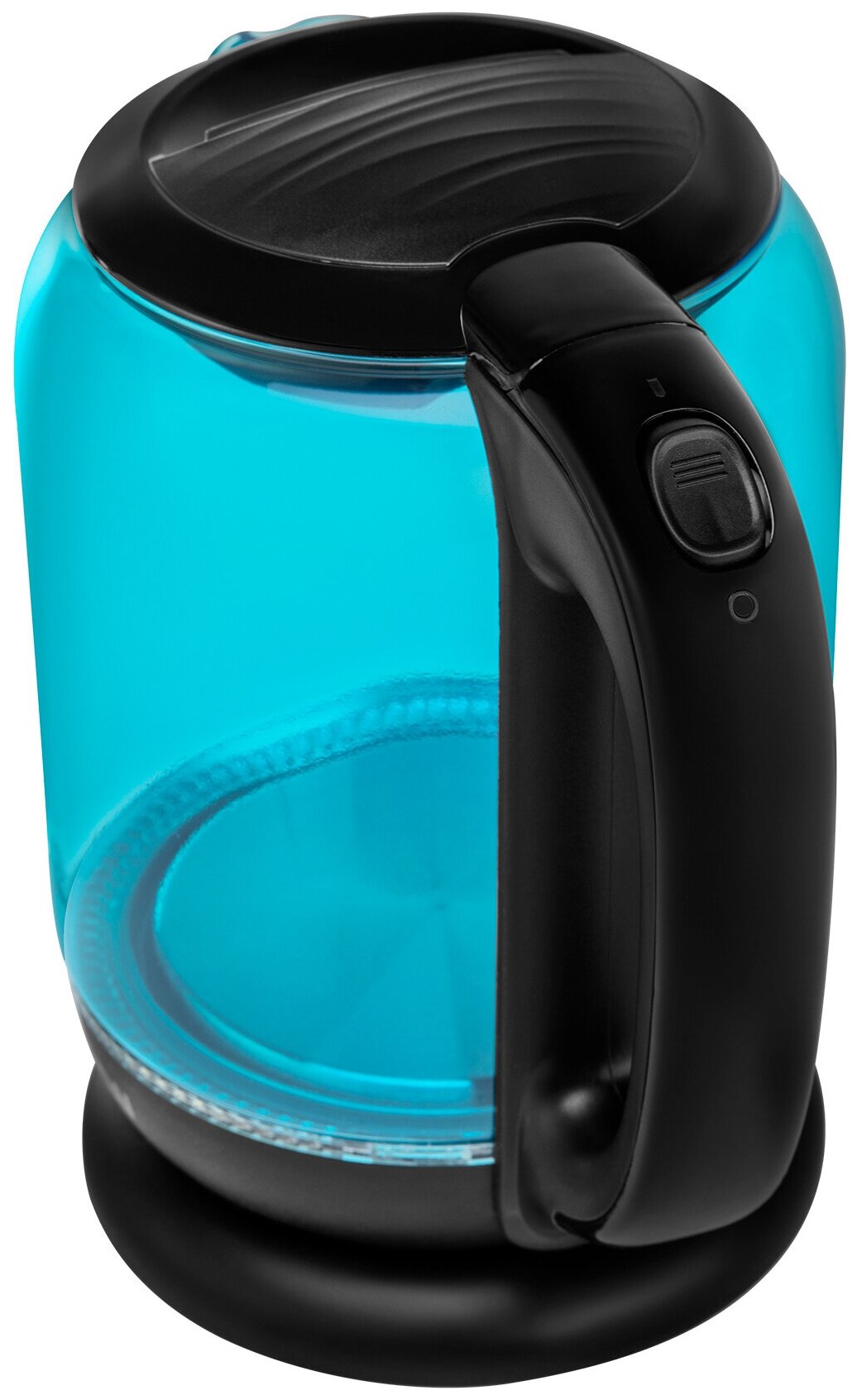 Чайник обладает мощностью 2200 Вт, поэтому даже 1.8 литра он вскипятит всего за несколько минут. Нагревательный элемент скрытого типа позволит быстро вскипятить и небольшой объем жидкости. Корпус выполнен из цветного жаропрочного стекла. Благодаря этому прибор имеет интересный внешний вид. Предусмотрен индикатор включения. Также имеется удобный индикатор уровня воды. Когда жидкость достигает нужной температуры, чайник автоматически отключается. Его крышку можно открыть, нажав на удобную кнопку. Его можно размещать на подставке 360 градусов так, как удобно пользователю. Реализована защита от включения устройства без воды.
