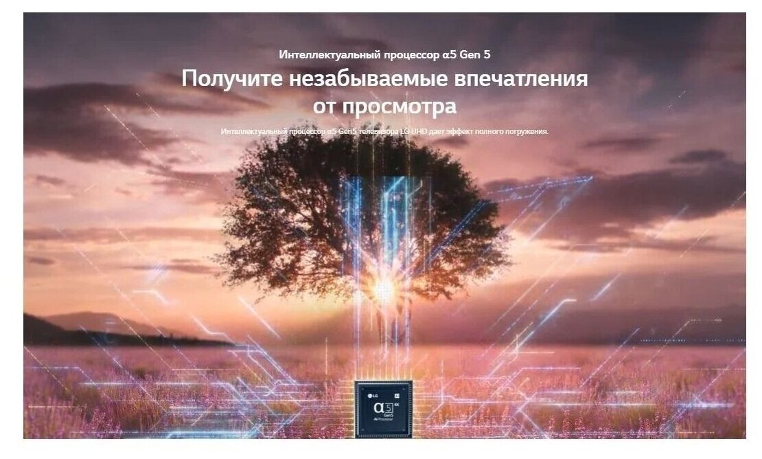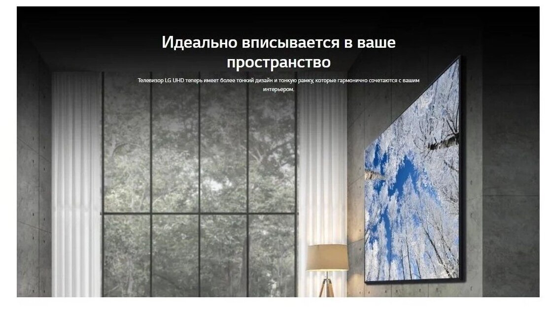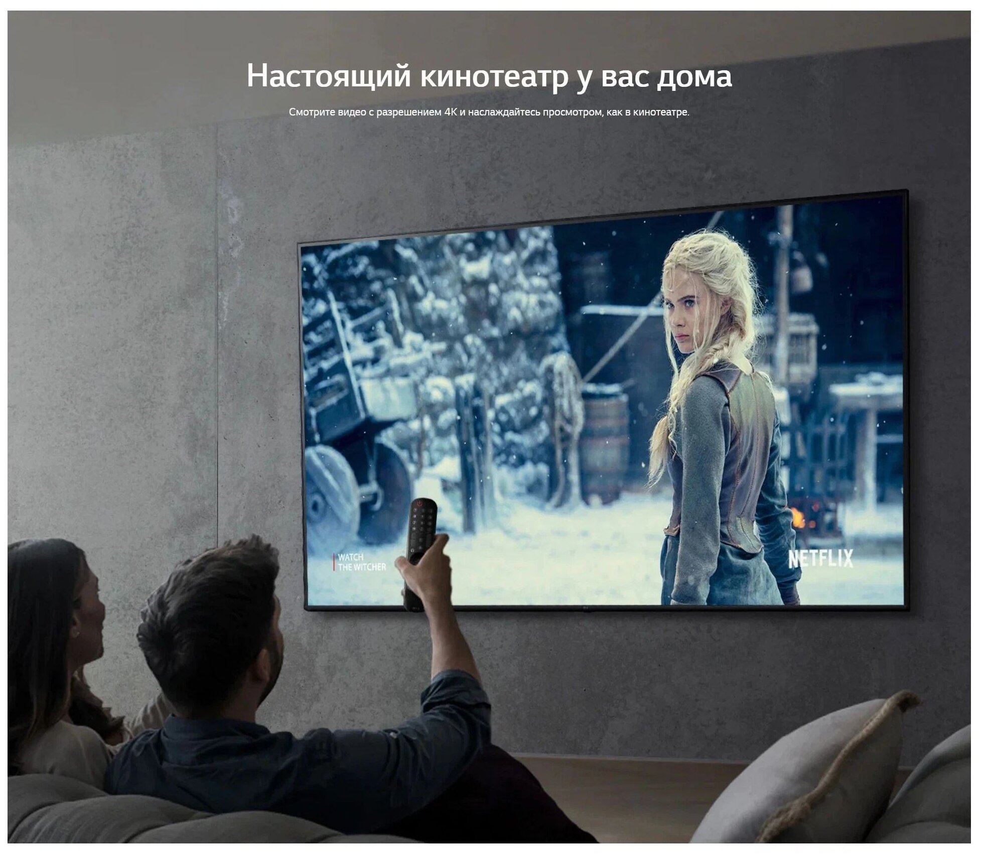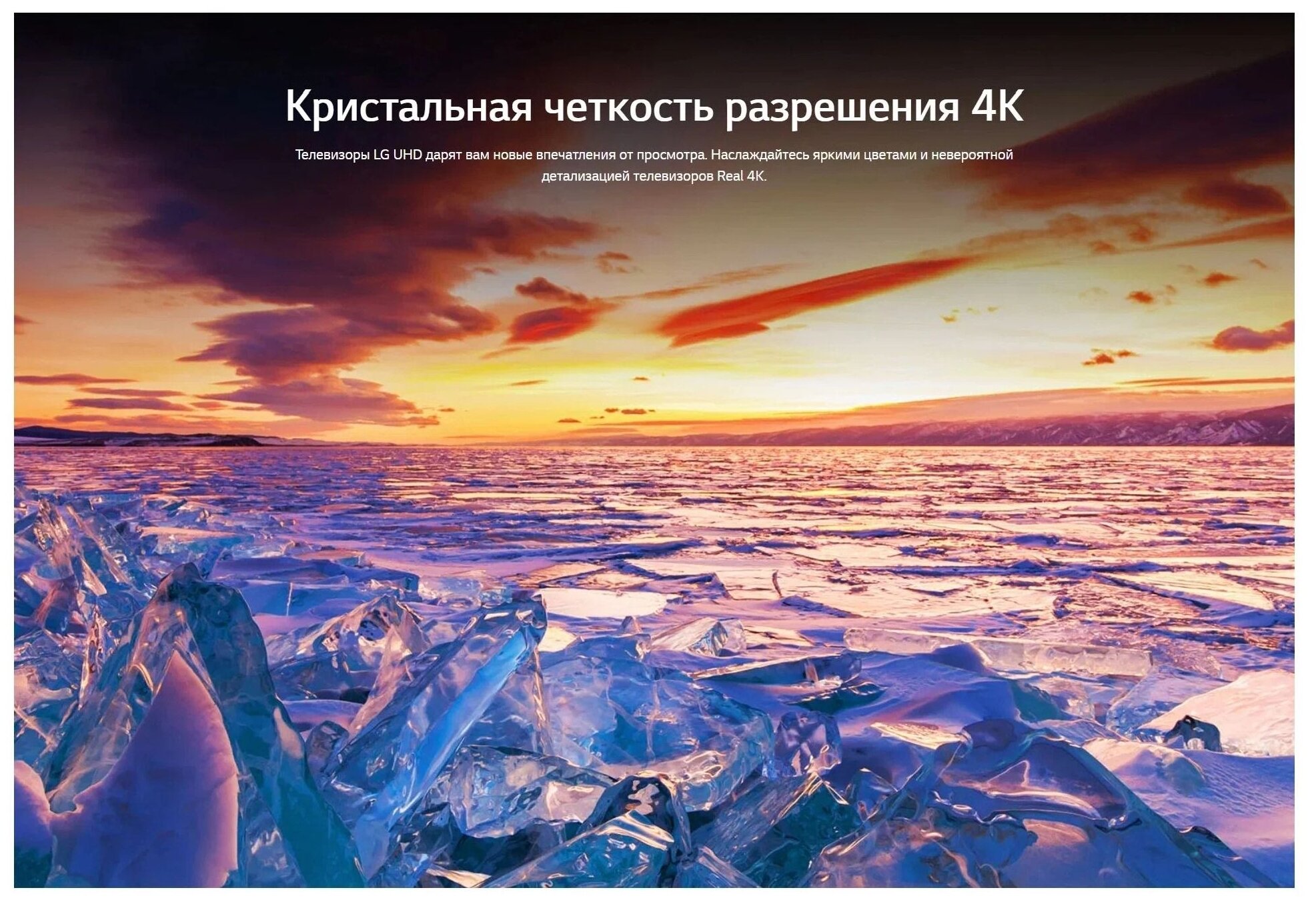 Настоящий 4K UHD. Нереальное погружение. Телевизоры LG UHD превосходят все ваши ожидания. Наслаждайтесь живым изображением и реалистичной цветопередачей благодаря улучшенному разрешению за счет увеличенного количества пикселей в 4 раза по сравнению с Full HD. Непередаваемые ощущения от просмотра. Настоящий кинотеатр у вас дома. FILMMAKER MODE и HDR обеспечивают потрясающий эффект погружения. Подключайтесь к любимым стриминговым платформам и смотрите любимые фильмы??и??сериалы. Оцените замысел режиссера. FILMMAKER MODE отключает сглаживание движения, сохраняя при этом исходное соотношение сторон, цветопередачу и частоту кадров. Этот режим позволяет точно передать оригинальное видение режиссера, поэтому вы видите фильм именно таким, каким он был задуман.До мельчайших деталей. LG UHD с функцией Active HDR обеспечивает точность деталей и цветопередачи. Наслаждайтесь любимыми фильмами в оригинальном качестве благодаря нескольким HDR-форматам, включая HDR10 и HLG. Быстрая и простая настройка игры. Управляйте всеми настройками в одном месте, используя режимы, оптимизированные для разных игровых жанров: FPS, RPG и RTS. Изменяйте контраст с помощью стабилизации черного и белого цвета для наилучшей видимости.