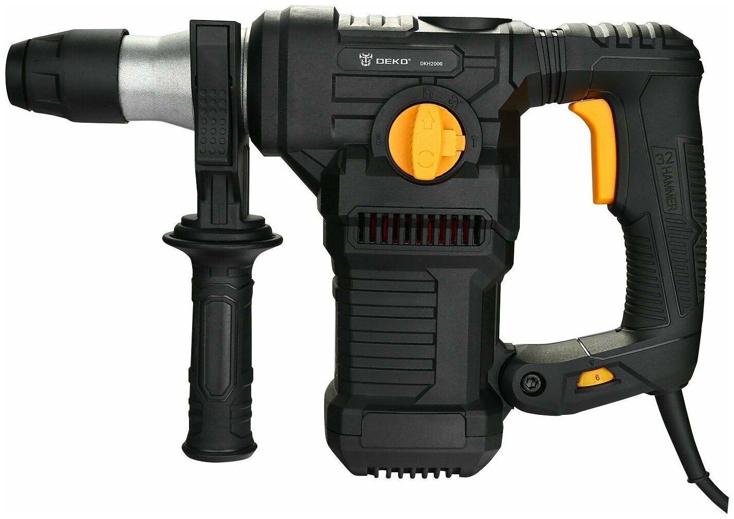 Перфоратор сетевой DEKO DKH2000 может работать в трёх режимах: сверление, ударное сверление, долбление. Переключение между ними осуществляется при помощи тумблера сбоку на корпусе. Патрон SDS-plus обеспечивает быструю и легкую замену оснастки. Дополнительная рукоять способствует уверенному удержанию инструмента в руках. Наличие кейса решает вопрос хранения и транспортировки перфоратора.